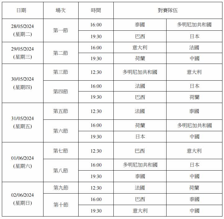 本屆賽事戲碼強勁,八支女排隊伍當中包括去年世界女子排球聯賽亞軍中國、東京奧運銀牌得主巴西及2022世界女子排球聯賽冠軍意大利,將聯同日本、荷蘭、泰國、多明尼加共和國及法國隊齊集澳門,展開連場激戰。一連六天賽事非常緊湊,賽事日程如下: