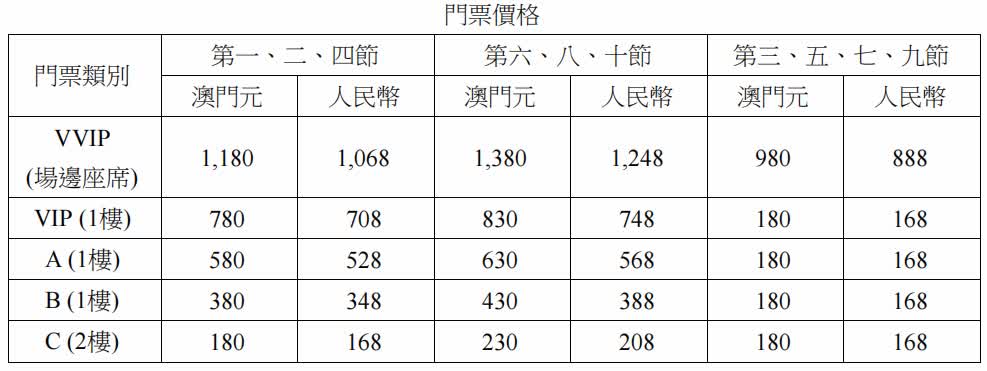 門票將於5月6日下午3時起公開發售,市民及旅客可透過大麥APP及小程序、MPay澳門錢包APP內mCoin平台、Cityline購票通、澳門售票網及電話預訂,或於5月7日早上11時起至5月27日晚上7時到廣星傳訊澳門門市購買,又或於賽事期間到現場購買門票。賽事門票價格由澳門元180圓至1,380圓不等,按座位區域及場次而定,所有票價以澳門元或人民幣計算,港元與澳門元同價,每人每場次限購最多4張門票,身高1.2米或以上憑票入場;身高1.2米以下且不佔用座位的兒童可由一名購票成人陪同免費入場,成人必須全程陪同,每名成人僅能帶一名免票兒童。