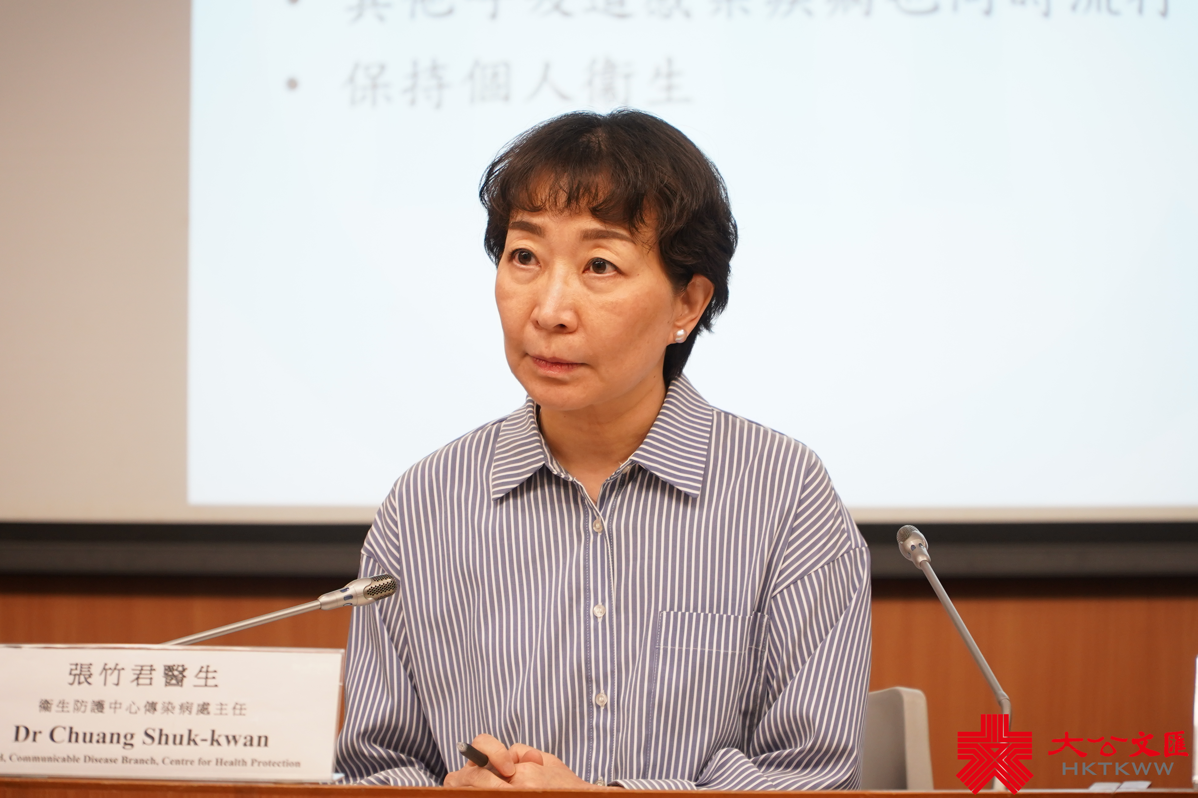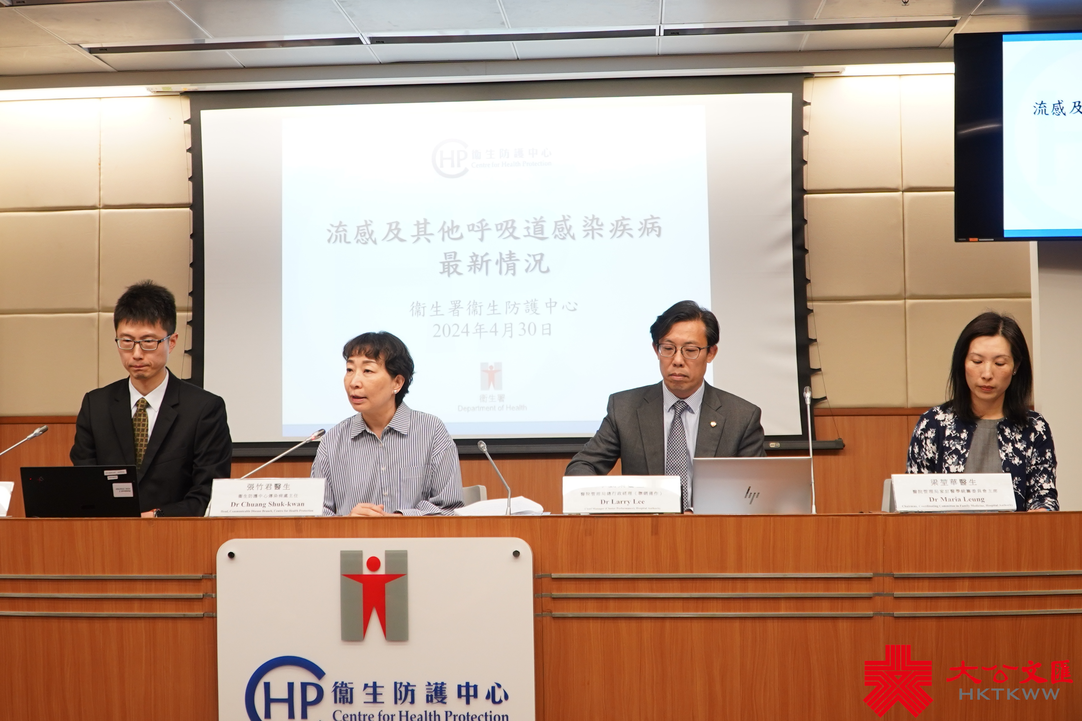 (大公文匯全媒體記者 李九歌)衞生署及醫院管理局(醫管局)今日(30日)下午舉行記者會,呼籲市民提高警覺,以應對上升的呼吸道感染疾病活躍程度。衞生署衞生防護中心傳染病處主任張竹君醫生、衞生防護中心傳染病處高級醫生黃凱基醫生、醫管局總行政經理(聯網運作)李立業醫生及醫管局家庭醫學統籌委員會主席梁堃華醫生出席。