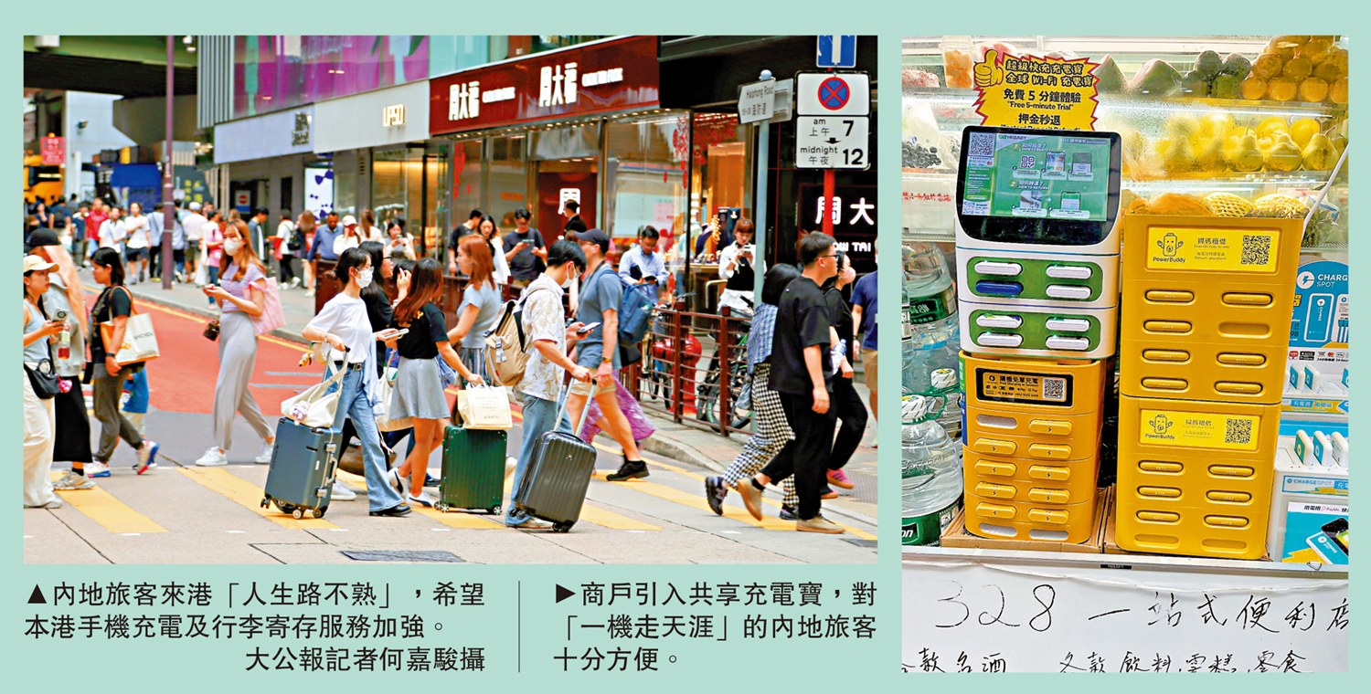 (大公報 記者 劉碩源)近年不少訪港旅客喜歡城市漫步的旅遊模式,大公報記者早前實地體驗九龍區遊客常走的路線,觀察旅客需求,發現不少旅客有充電和寄存行李需求。目前本港已有不少商戶引入共享充電寶,但各區普及率有較大差異。