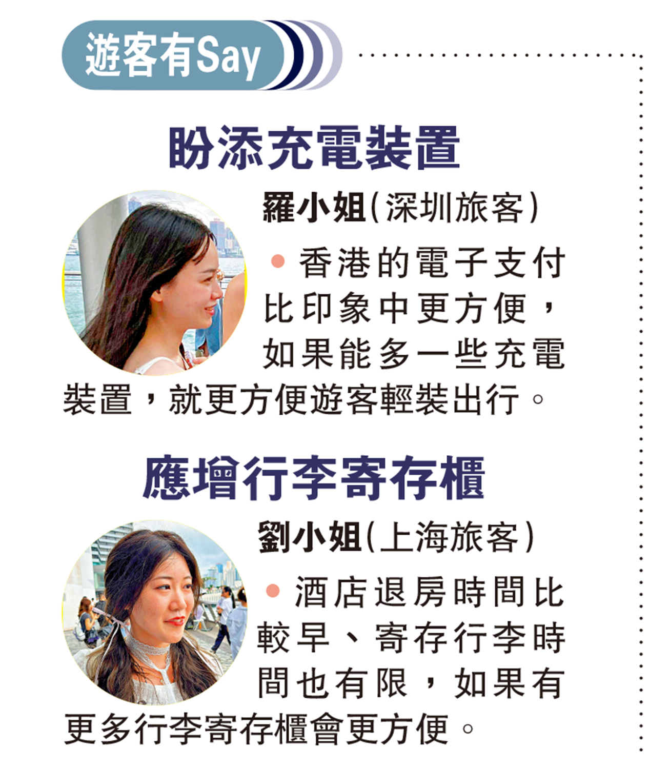 記者早前向隨機8名旅客了解意見,6名旅客向記者建議可在旅遊熱點增設行李寄存機。內地旅客陳先生向記者表示,賓館未必會在退房後提供行李寄存服務。陳表示,他和家人乘坐晚上班機,但中午退房後,拖着行李箱就不敢「放開手腳」深入其他地區,亦不敢進入街旁小店,而拖着行李箱的疲憊亦讓旅行體驗大打折扣。他認為,若有行李寄存的機器,便可以享受完「臨行前的幾小時」。