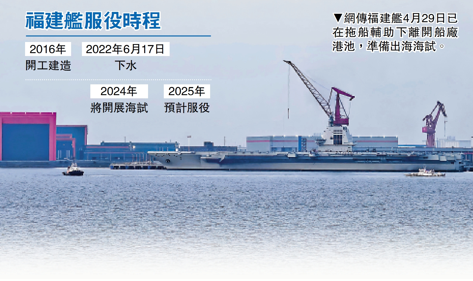 福建艦是中國完全自主設計建造的首艘彈射型航空母艦,採用平直通長飛行甲板,配置電磁彈射和阻攔裝置,滿載排水量8萬餘噸。2022年6月17日,福建艦在江南造船廠成功下水,隨即按計劃開展舾裝和繫泊試驗。