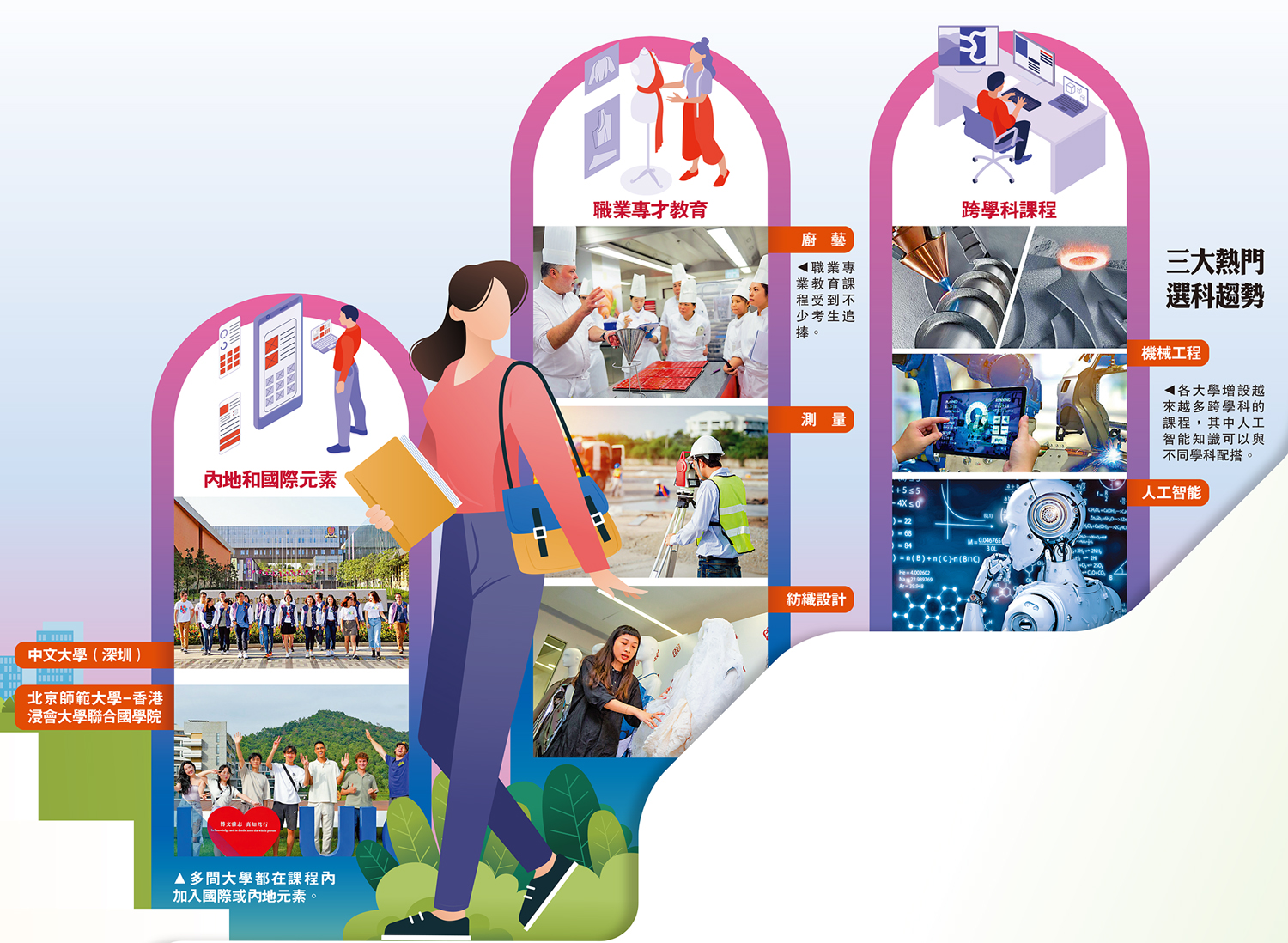 第三則是課程的國際化趨勢。吳寶城介紹,有不少考生會考慮赴海外還是在本地升學,但其實考生還有中間選項。吳寶城續指,現在很多本地課程加入了很多國際或者內地的元素,例如嶺南大學開設一系列博雅教育課程,學生除了在本地讀書外,亦要赴海外上課;中大則設有中大及中大(深圳)校園,兩地相互配合,學生可體驗兩地校園。
