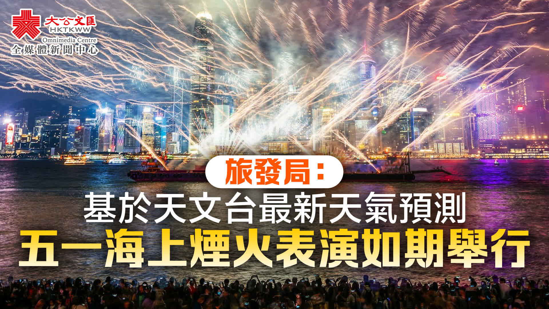 大公文匯網報道,「五一」煙火匯演定於今(5月1日)晚8時在尖東沙咀海濱花園對出海面上演,但本港今日時有降雨,天氣不穩,令市民遊客擔心會否空跑一趟。煙火演出開始4小時前,旅發局終於宣布,基於天文台最新天氣預測,今晚的海上煙火表演將如期舉行。