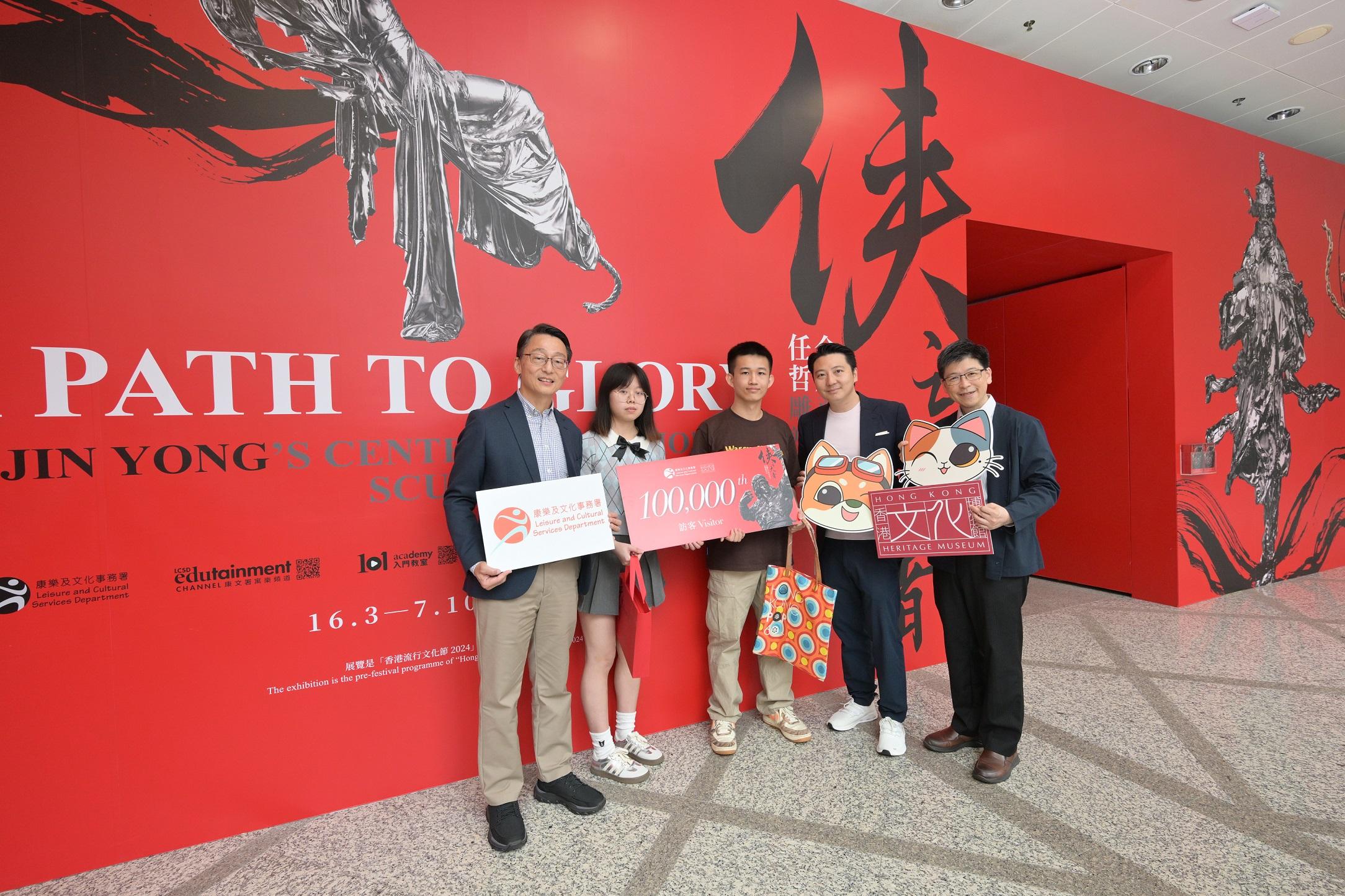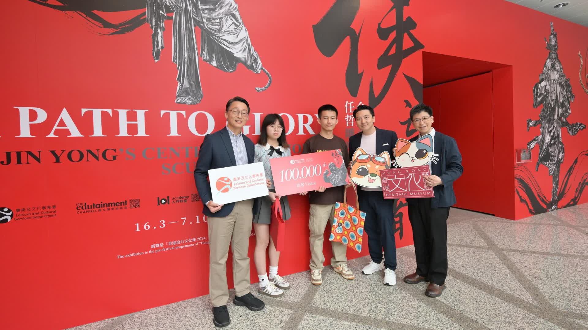 大公文匯全媒體報道,香港文化博物館為紀念查良鏞博士(金庸)百年誕辰舉辦的「俠之大者──金庸百年誕辰紀念.任哲雕塑展」,今日(1日)迎來第100000名參觀者。康樂及文化事務署署長劉明光及聯合策展人方圓明親臨博物館,向第100000名參觀者送上別具心思的紀念品,包括由雕塑家任哲製作及親筆簽名的製作的限量版圖錄及精美的展覽海報等。