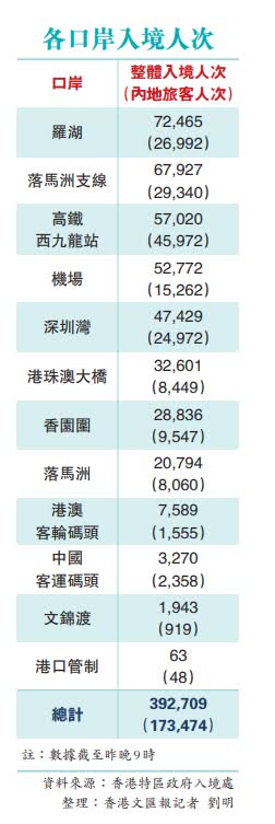 截至昨晚9時,香港各口岸有688,588人次出入境,當中392,709人次屬入境,內地訪客佔173,474人次,連同其他訪客有199,145人次。入境以羅湖最繁忙,有72,465人次經該口岸進入香港,其次為落馬洲支線的67,927人次和高鐵西九龍站的57,020人次,而機場有52,772人次入境,是香港第四個最繁忙的口岸。