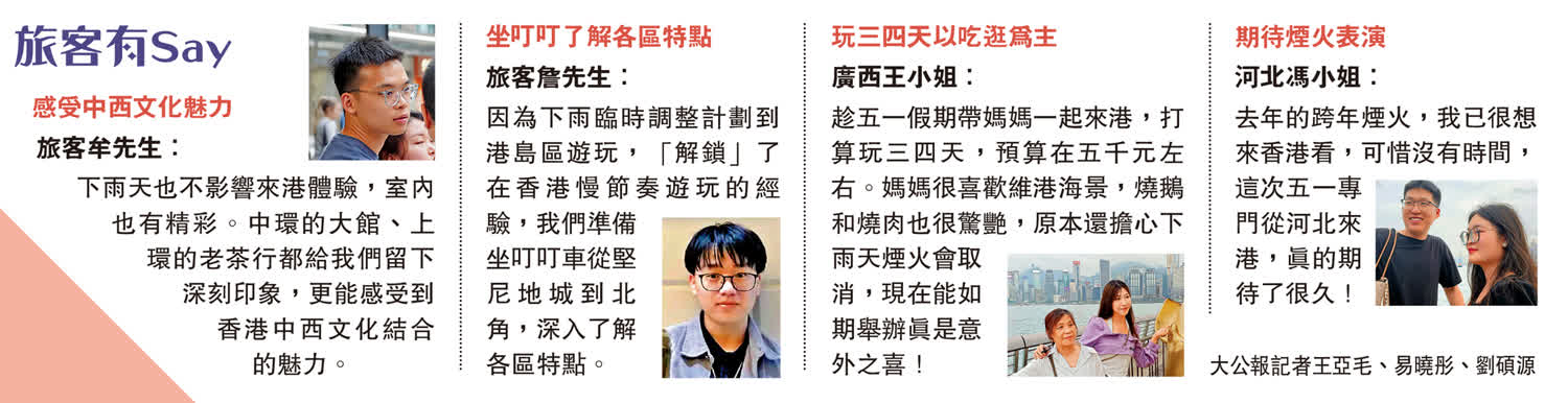 為吸引更多旅客來港,本港舉辦多個活動,傳統遊客區昨日遊人如鯽,深度遊路線亦吸引不少遊客。旅發局舉辦的首場海上煙火表演備受矚目,大公報記者昨午三時到尖沙咀海濱公園一帶觀察,已有遊客陸續到海旁霸位,有人更帶同椅子等候觀賞煙火。