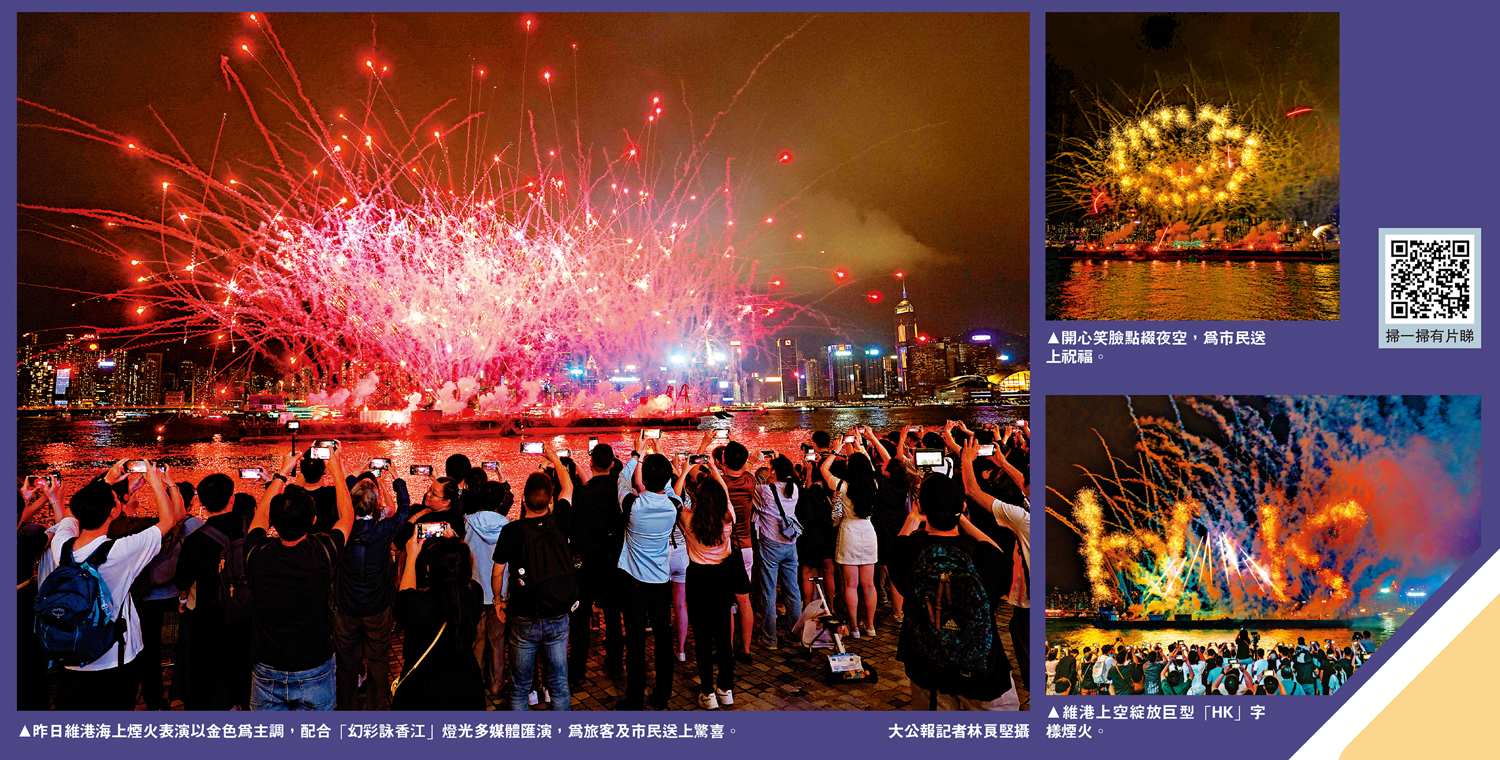 海上煙火表演昨晚8時在尖沙咀海濱花園對出海面舉行,全長約10分鐘,離岸130米的躉船將多枚煙火發放至最高約100米。煙火表演以金色為主調,配合幻彩詠香江燈光多媒體匯演,展示多項特別圖案,包括開心笑面、繁花盛開、巨型「HK」字樣,以及星光璀璨的圖案,光彩奪目。海旁看煙火的市民和旅客紛紛高舉手機記錄精彩的畫面,現場煙火聲和歡呼聲不絕於耳。