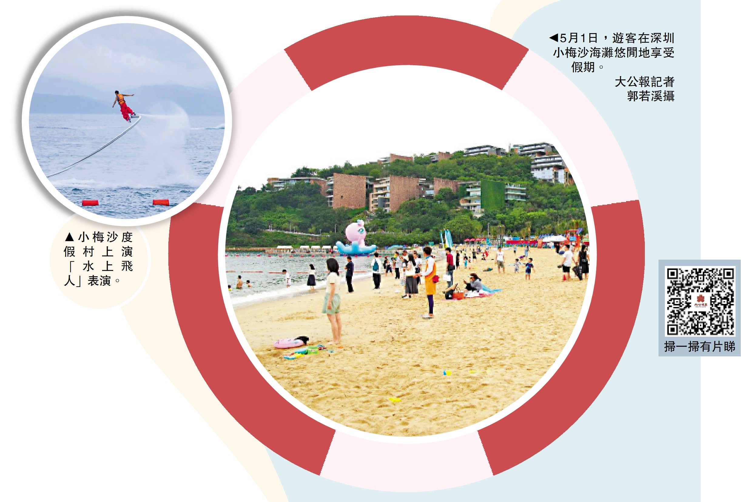 (大公報記者 郭若溪 深圳報道)「五一」假期,不妨趁假日開啟一趟山海奇妙之旅。5月1日,深圳首個文旅業態城市更新項目——深圳小梅沙度假村正式試運營。作為「鵬城八景」之一,小梅沙曾與大梅沙合稱「梅沙踏浪」,承載了不少深圳人的記憶。歷經多年改造升級,小梅沙度假村終於再度與市民及遊客見面。今後,港人北上深圳度假休閒,從蓮塘口岸搭乘地鐵8號線可直達小梅沙站,出站即可親海踏浪,沉浸式體驗多元化的沙灘、海上娛樂活動。結合「五一」旅遊消費熱潮,深圳鹽田區啟動了以「fun享鹽田·show美山海」為主題的深圳黃金海岸旅遊嘉年華活動,多層次滿足遊客假日文旅需求。