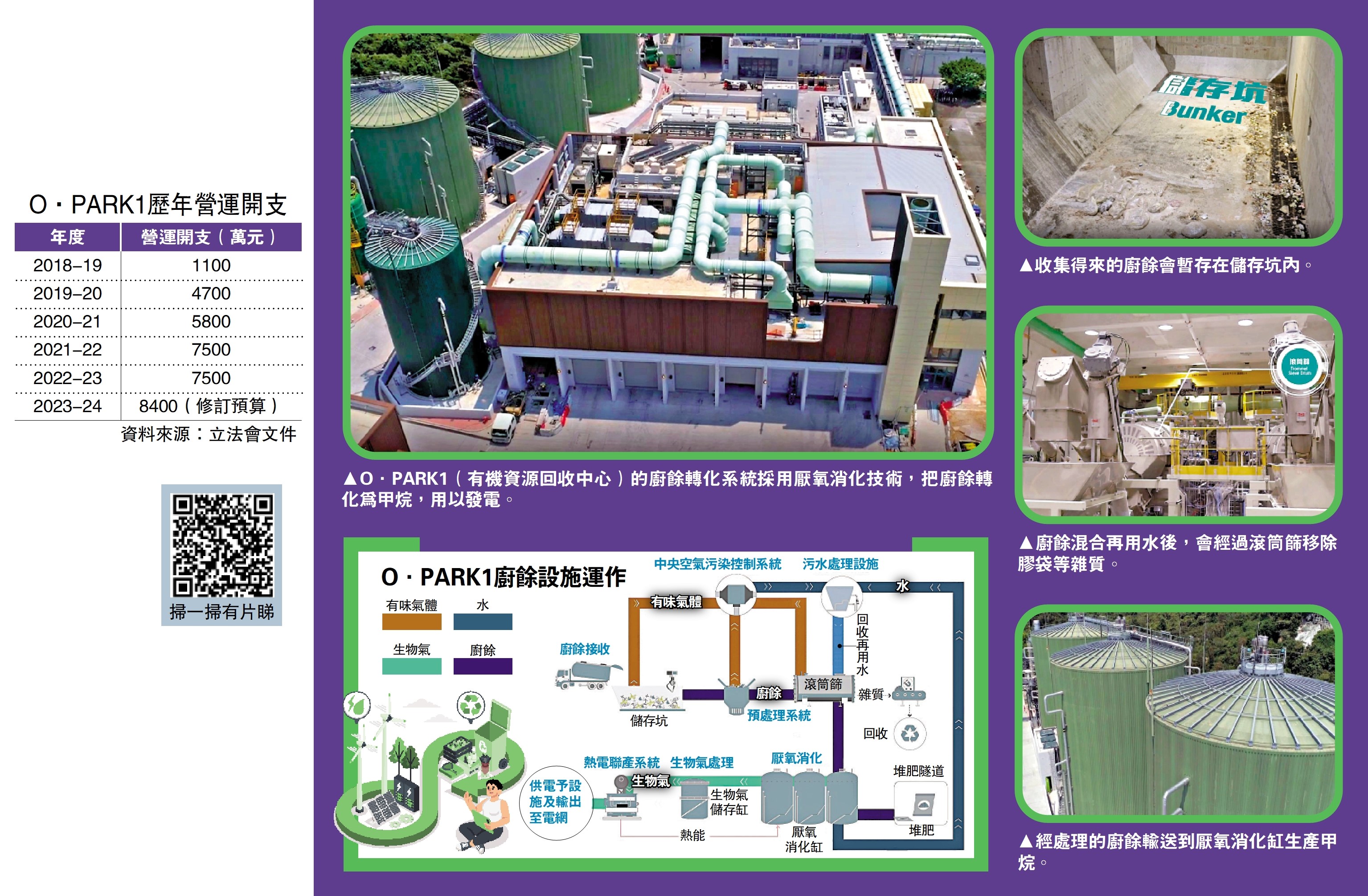 廚餘堆肥不受農戶歡迎,廚餘發電又是否合乎經濟效益?以2018年開始營運的O·PARK1為例,當年建造已耗資逾15億元,而按環保署提交予立法會的資料,O·PARK1每年的營運開支由1100萬元至7500萬元不等,而且年年遞增,2023/24年度的預算更達8400萬元,較2022/23年度上升逾一成。然而按O·PARK1網頁資料,上址採用厭氧分解技術把廚餘轉化為生物氣(一種與天然氣相近的可再生能源資源)以作發電,可自給自足,而滿載運轉時,每年可輸出約1400萬度電供3000戶家庭使用。