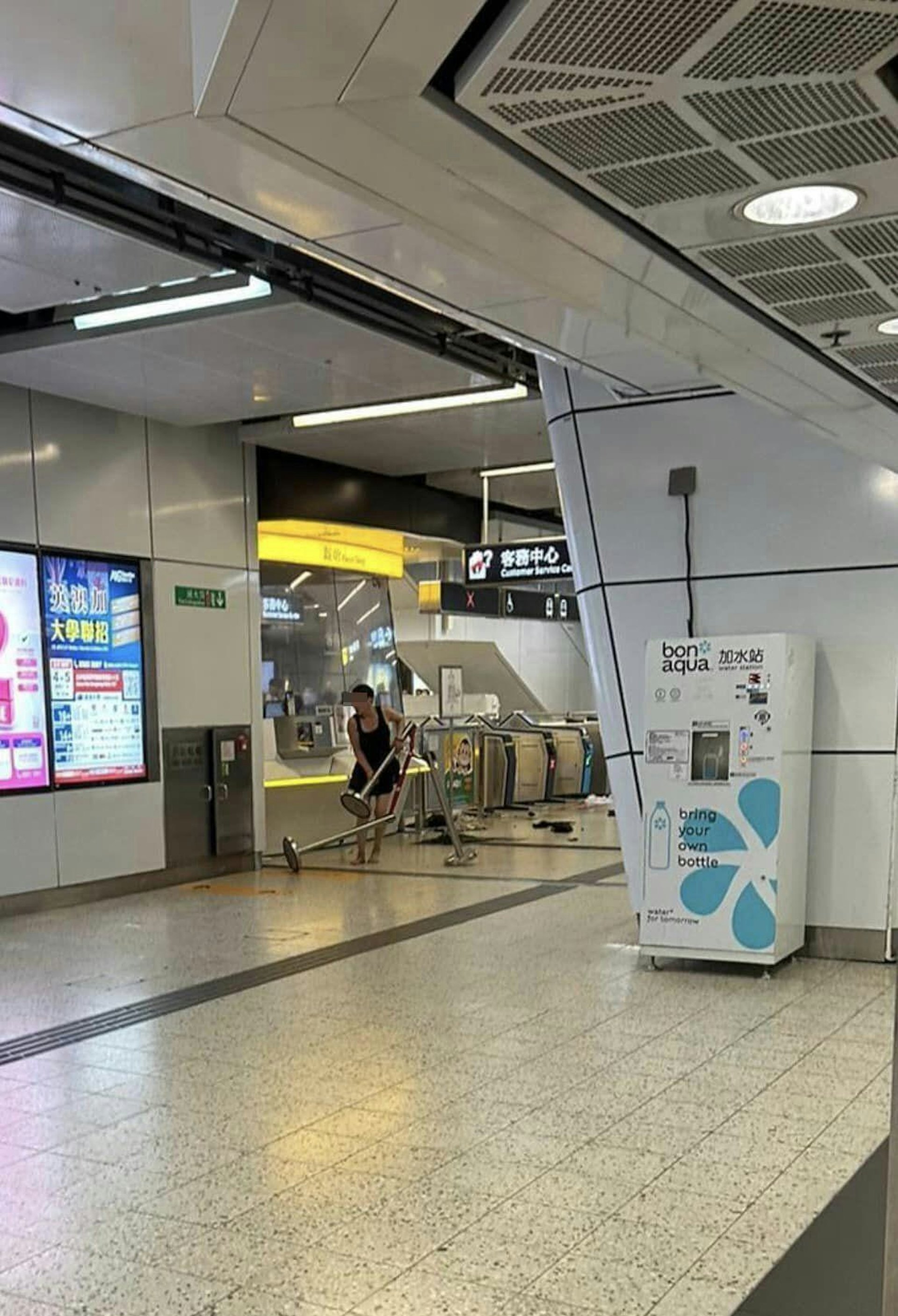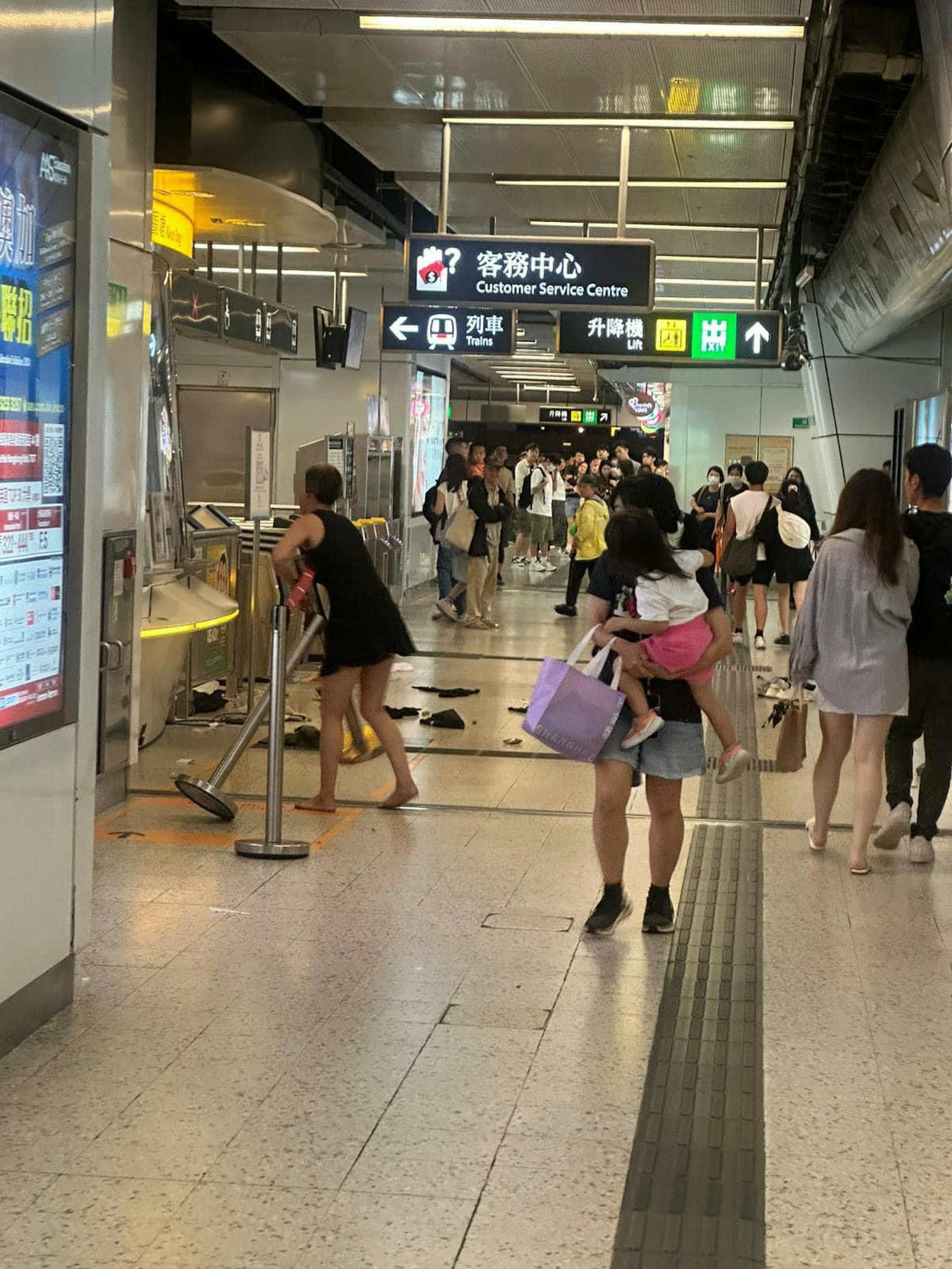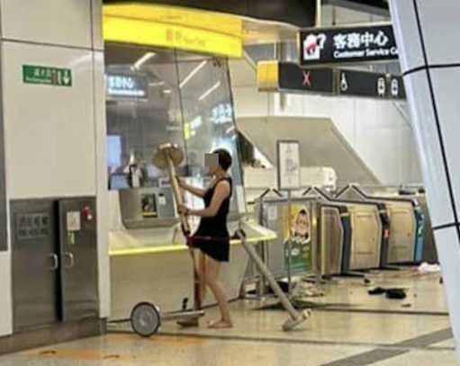 從相片見到,該名女子穿黑衣連身短裙、赤腳,相當大力地拿起排隊欄杆的拉帶柱攻擊票務站,現場其他拉帶柱全部倒下,周邊更是滿地垃圾,相當混亂。