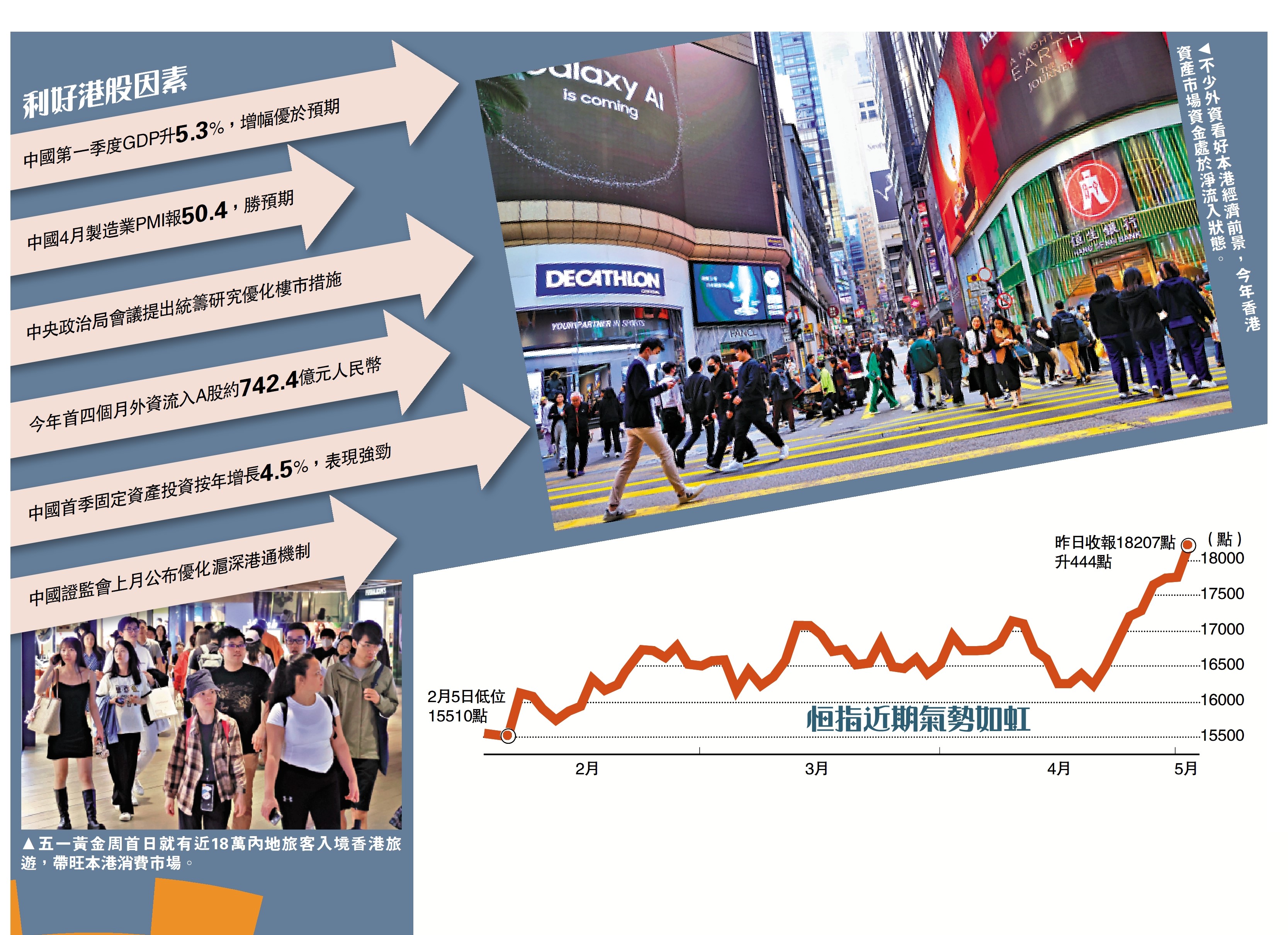恒指昨日再升444點,重上萬八關創今年新高,連升8日累漲1983點,創2018年以來最長升市。同時,在內地五一假期沒有北水流入的情況下,昨日港股成交額超過1100億元,再次反映資金看好港股前景。