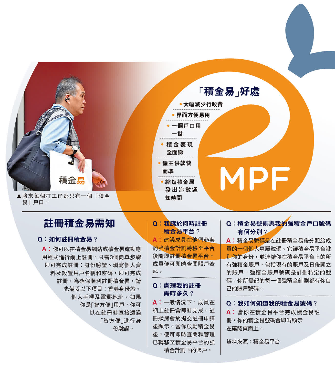 劉麥嘉軒續稱,將來每個打工仔都只有一個「積金易」戶口,當成員所屬的強積金計劃加入「積金易」平台後,透過一個戶口,一次過清楚查看在不同計劃下的強積金結餘。另外,目前整合不同強積金戶口一般需時兩至三個星期,當全部計劃完成轉移上平台後,處理時間將會縮短一半。