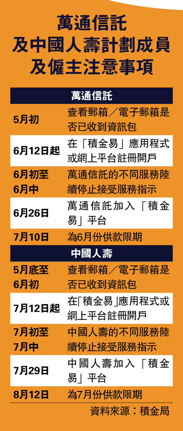 積金局行政總監鄭恩賜表示,萬通剛於4月底向計劃成員及僱主寄出資訊包,內有戶口資料轉移的重要日子及資訊。萬通的計劃成員及僱主由6月12日起,根據資訊包內的註冊步驟,於「積金易」的流動應用程式或網上平台,利用香港身份證或「智方便」進行註冊。至於中國人壽則將於5月底寄出資訊包,其計劃成員及僱主由7月12日起進行註冊。截至2023年12月底,萬通信託及中國人壽分別有大約7000個及3000個僱主賬戶,以及約5.6萬個及4.3萬個計劃成員賬戶,資產規模分別為50億元及40億元。