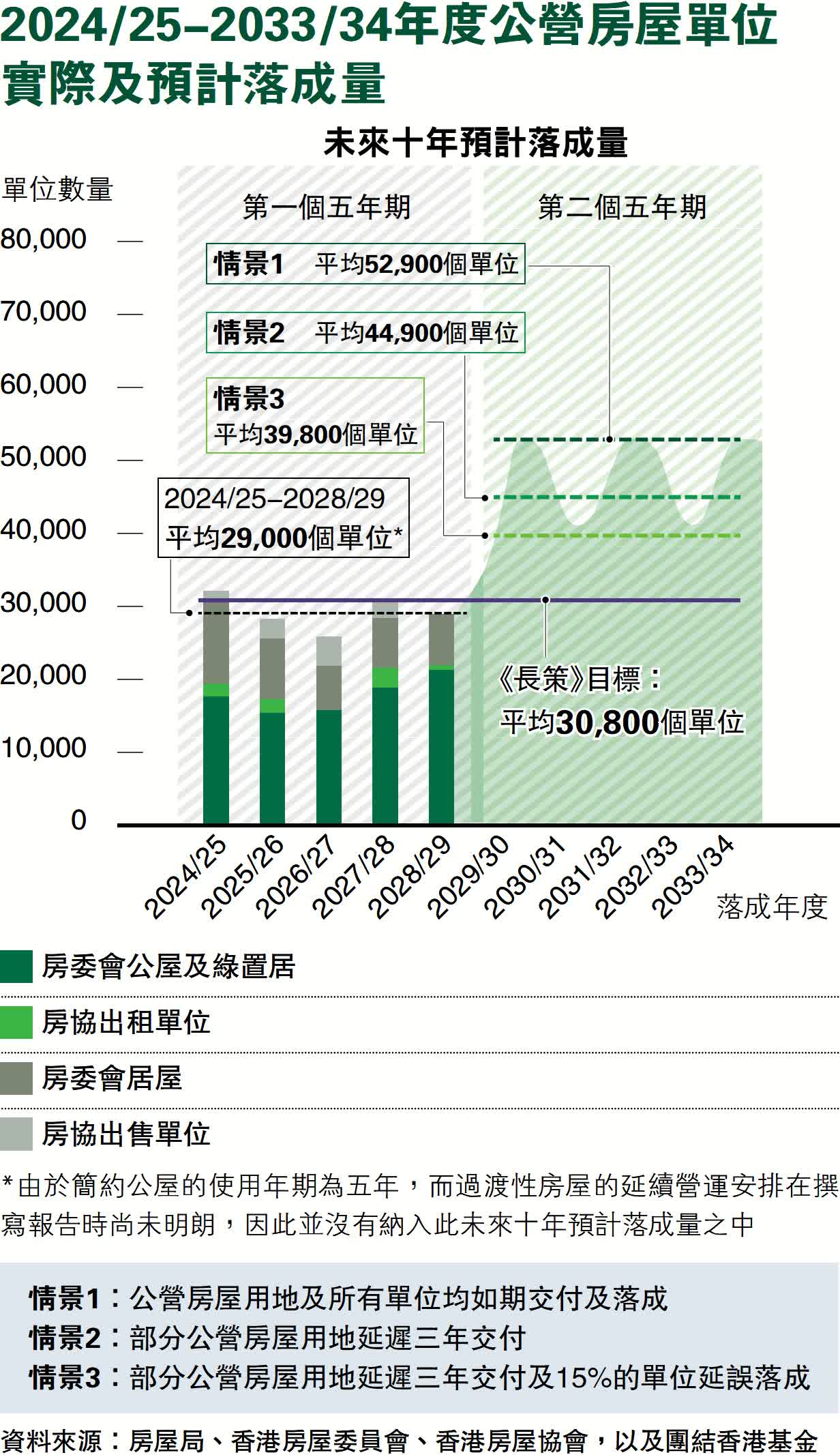 同時,若所有已公布的公營房屋用地都能按時交付及施工,預計到第二個五年期時,公營房屋單位量每年平均落成5.29萬個,未來十年落成量將達到約41萬個單位,較《長策》目標高出33%,且即使在用地交付和工程延誤的設定情景中,最終落成量仍會比《長策》目標高出10%。