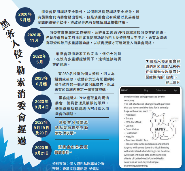 黑客組織ALPHV去年9月4日獲取並利用消委會一個具管理員權限的賬戶,透過虛擬私有網絡(VPN)進入消委會的網絡,導致消委會的93個系統遭到惡意加密,11個伺服器及端點裝置被黑客入侵,其間警報系統一直沒有發出警示。