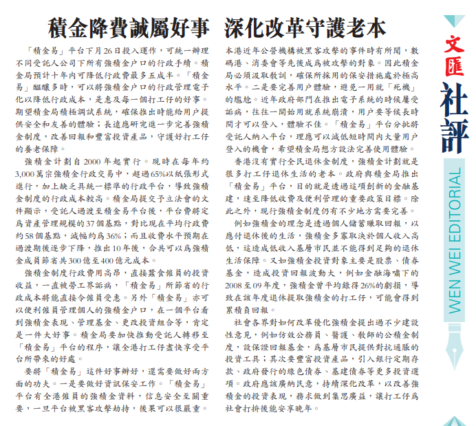 「積金易」平台下月26日投入運作,可統一辦理不同受託人公司下所有強積金戶口的行政手續。積金局預計十年內可降低行政費最多五成半。「積金易」醞釀多時,可以將強積金戶口的行政管理電子化以降低行政成本,是惠及每一個打工仔的好事。期望積金局積極調試系統,確保推出時能給用戶提供安全和友善的體驗;長遠應研究進一步完善強積金制度,改善回報和豐富投資產品,守護好打工仔的養老保障。