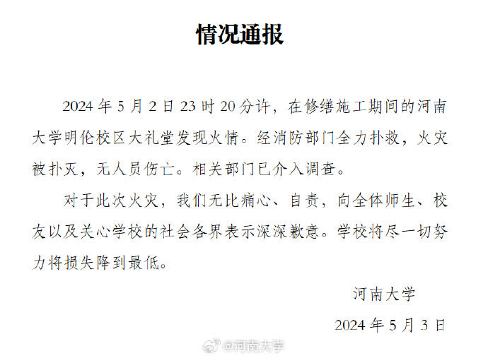 據開封消防通報,2024年5月2日23時22分,開封市消防救援支隊指揮中心接到報警稱,河南大學明倫校區一建築房頂着火,無人員被困。接警後,支隊指揮中心立即調派力量趕赴現場處置。目前,火勢已被控制。