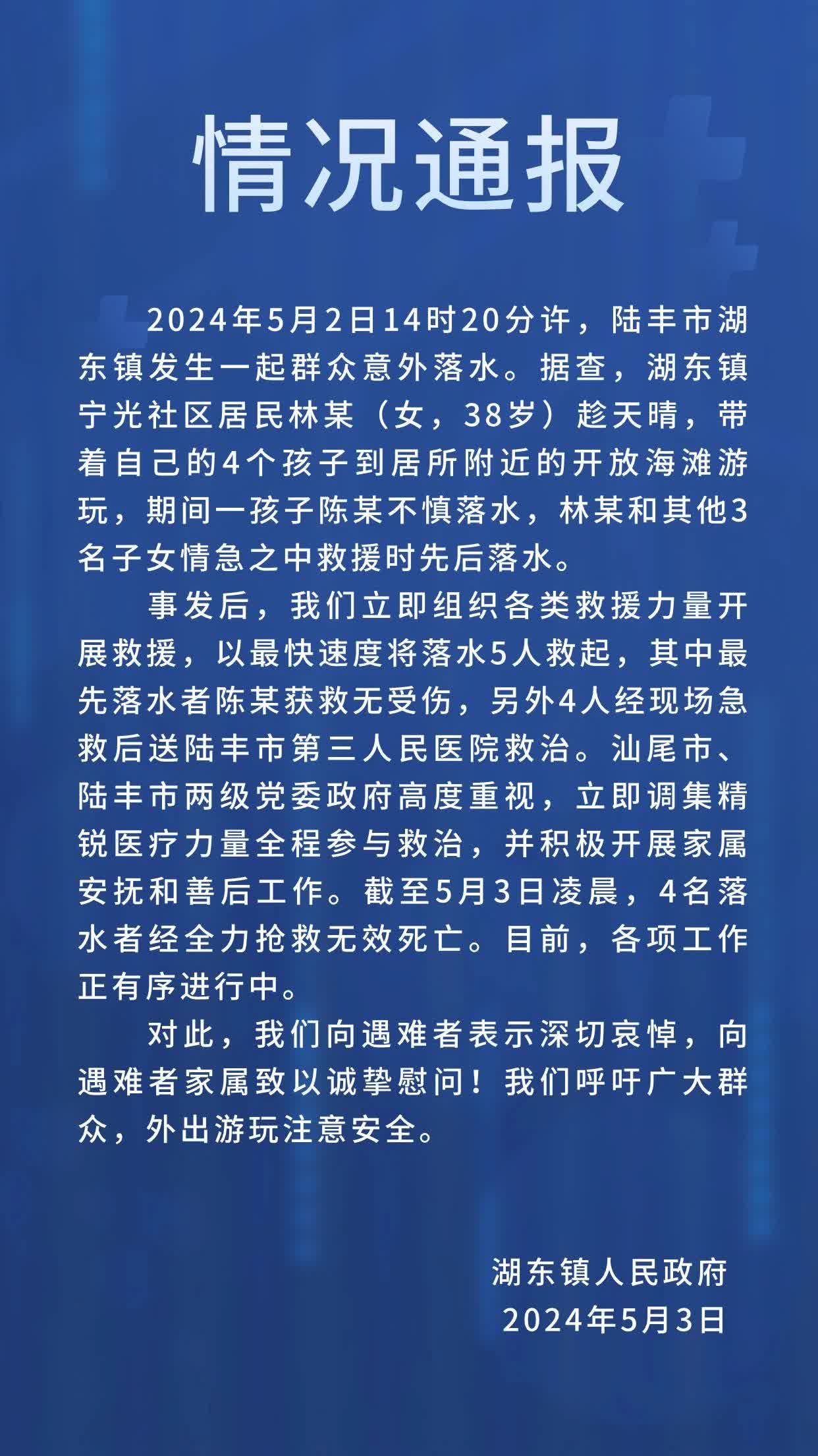 2024年5月2日14時20分許,陸豐市湖東鎮發生一起群眾意外落水。據查,湖東鎮寧光社區居民林某(女,38歲)趁天晴,帶着自己的4個孩子到居所附近的開放海灘遊玩,期間一孩子陳某不慎落水,林某和其他3名子女情急之中救援時先後落水。