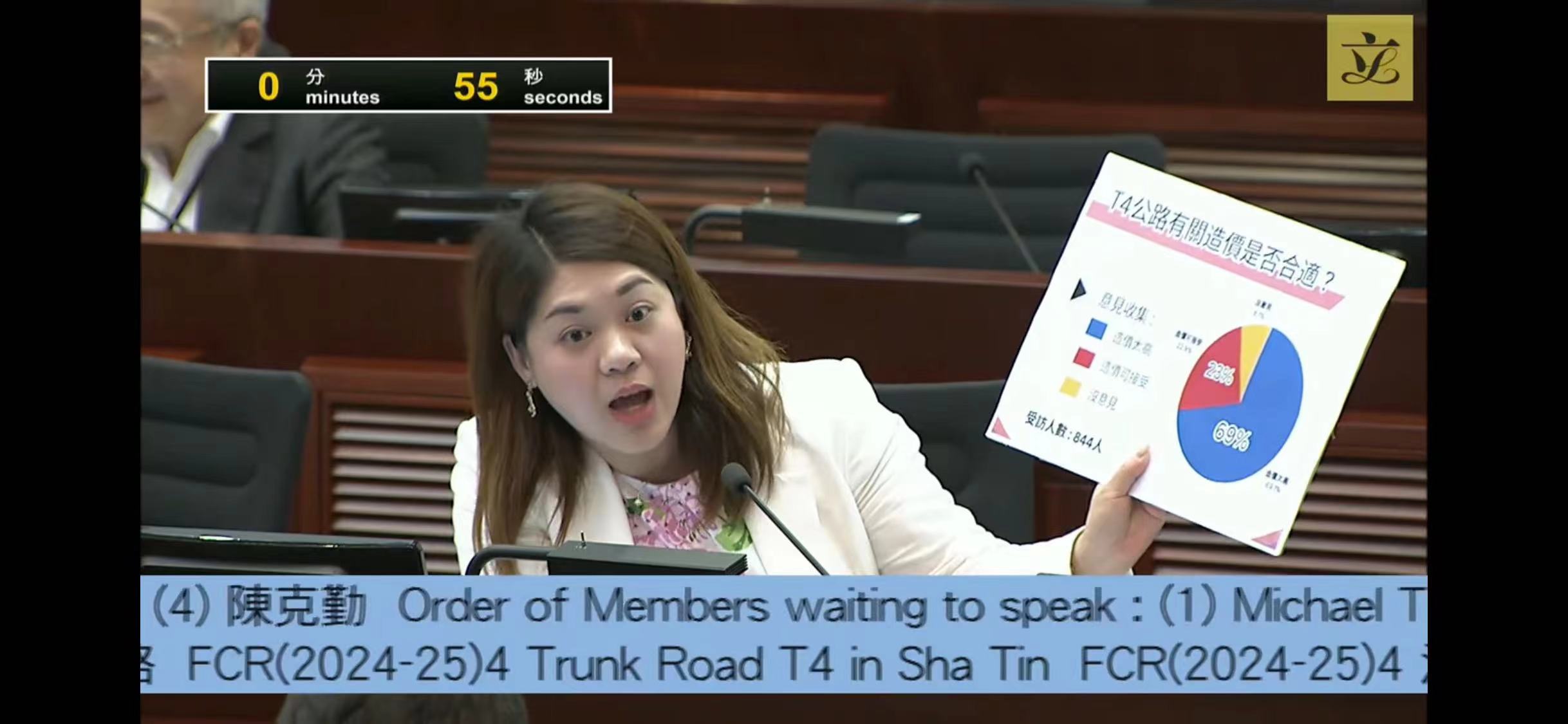 T4號主幹路項目造價問題不可避免地成為本次審議的重點關注。議員林素蔚展示早前在沙田、馬鞍山、烏溪沙地區,針對建設T4公路意願,訪問800多位市民的數據。數據顯示,有超過七成的受訪市民表示有需要建設這一公路路段,僅21.4%認為沒必要。而造價問題上,69%的受訪市民表示造價太高。她表示,該區市民接受新建公路,但是造價太貴無法接受。