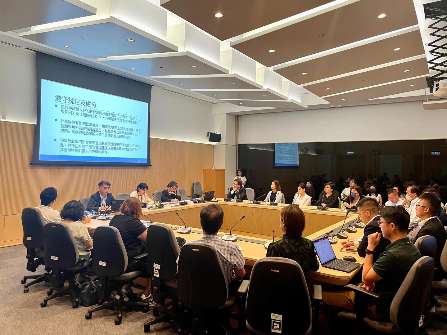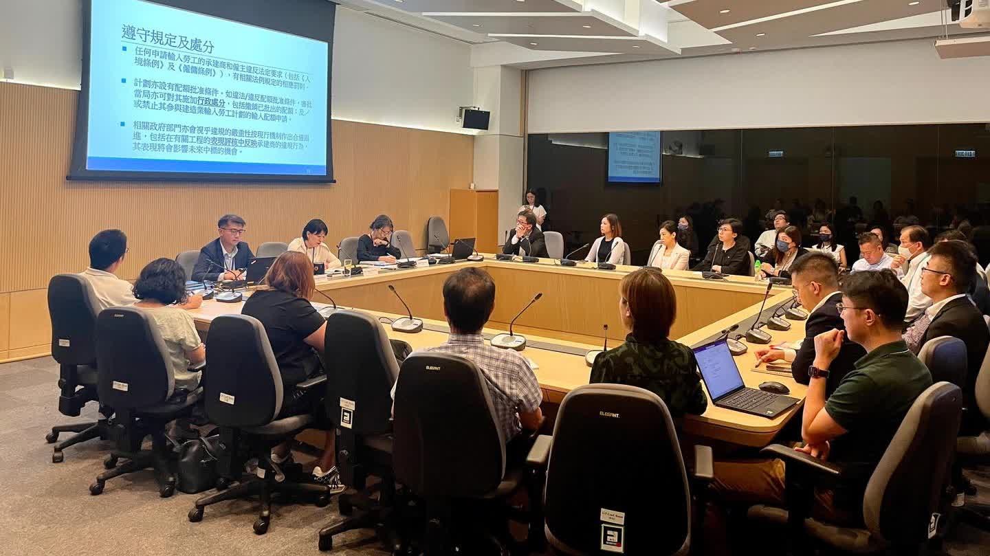 發展局在會上再次提醒業界,要求總承建商須按規定進行本地招聘,在證明無法聘請足夠及合適的本地人手後,其輸入勞工的申請才獲受理;相關工程必須符合不少於1∶2的人手比例的規定,即1名輸入勞工對最少2名全職本地勞工;任何情況下不得以輸入勞工取代原來在職的本地僱員;以及輸入勞工的聘用條款必須與本地招聘所用的條款相同,工資不得低於在計劃特設的網頁公布相關職位當時適用的每月工資中位數,聘用條款及工資須於「標準僱傭合約」中列明。