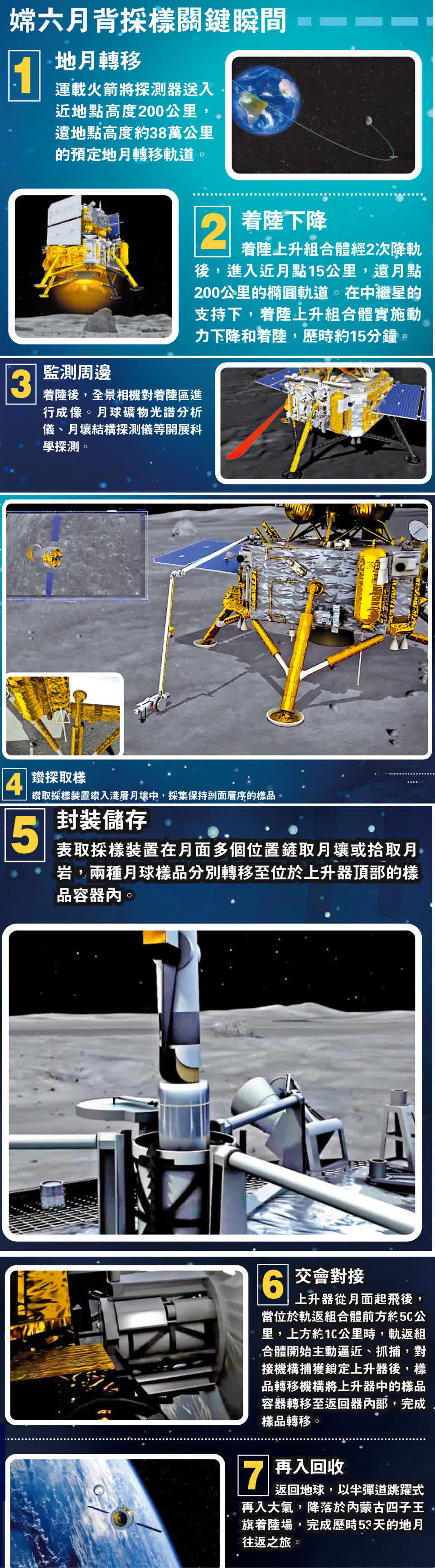 容啟亮表示,在嫦娥五號的經驗之上,嫦娥六號的採樣裝置進行多項改進。理大團隊在月表採樣上,研製了兩個採樣器、兩個近攝像機,其中一個採樣器應對較鬆散的月壤,另一個應對黏性較大的月壤。採樣之後,會將月壤樣品放入初次封裝系統。這個系統包括將月壤帶回地球的樣品罐。樣品罐密封後,由採樣器將樣品罐提升到上升器的頂部放置好。此後,上升器要在月面起飛,達到預定軌道後與軌道器、返回器組合體交會對接。月球樣品從上升器轉移到返回器,最後返回地球。