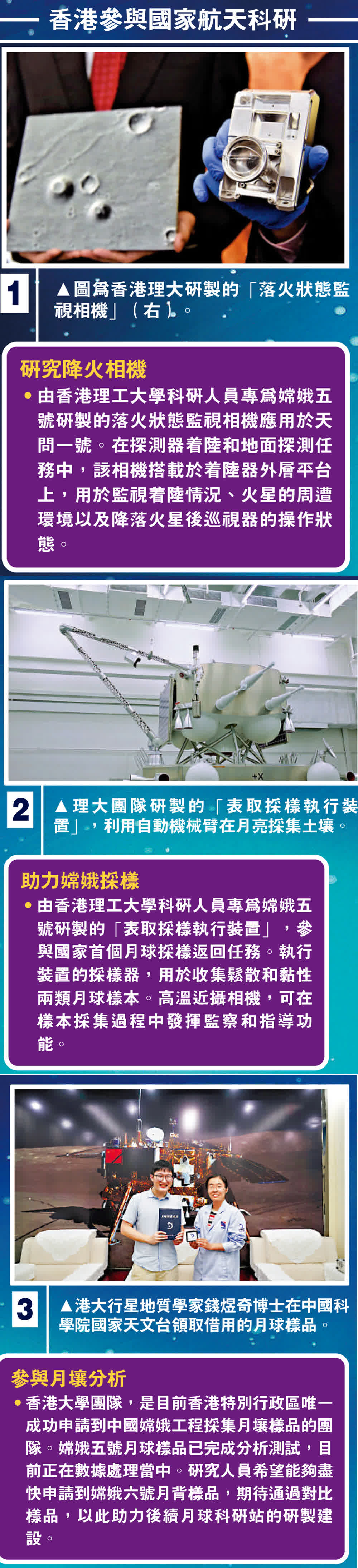 在中國航天領域,香港理工大學教授容啟亮是業界最知名的香港科學家和合作夥伴。嫦娥三號、四號、五號、六號以及天問一號,在探月和探火領域的五個重要探測器,容啟亮團隊都參與設計研製了其中相當關鍵的部分。特別是在嫦娥五號任務中,容啟亮團隊研製表取採樣執行裝置,成功採集到中國第一批月球樣品,並獲得業內的高度評價。