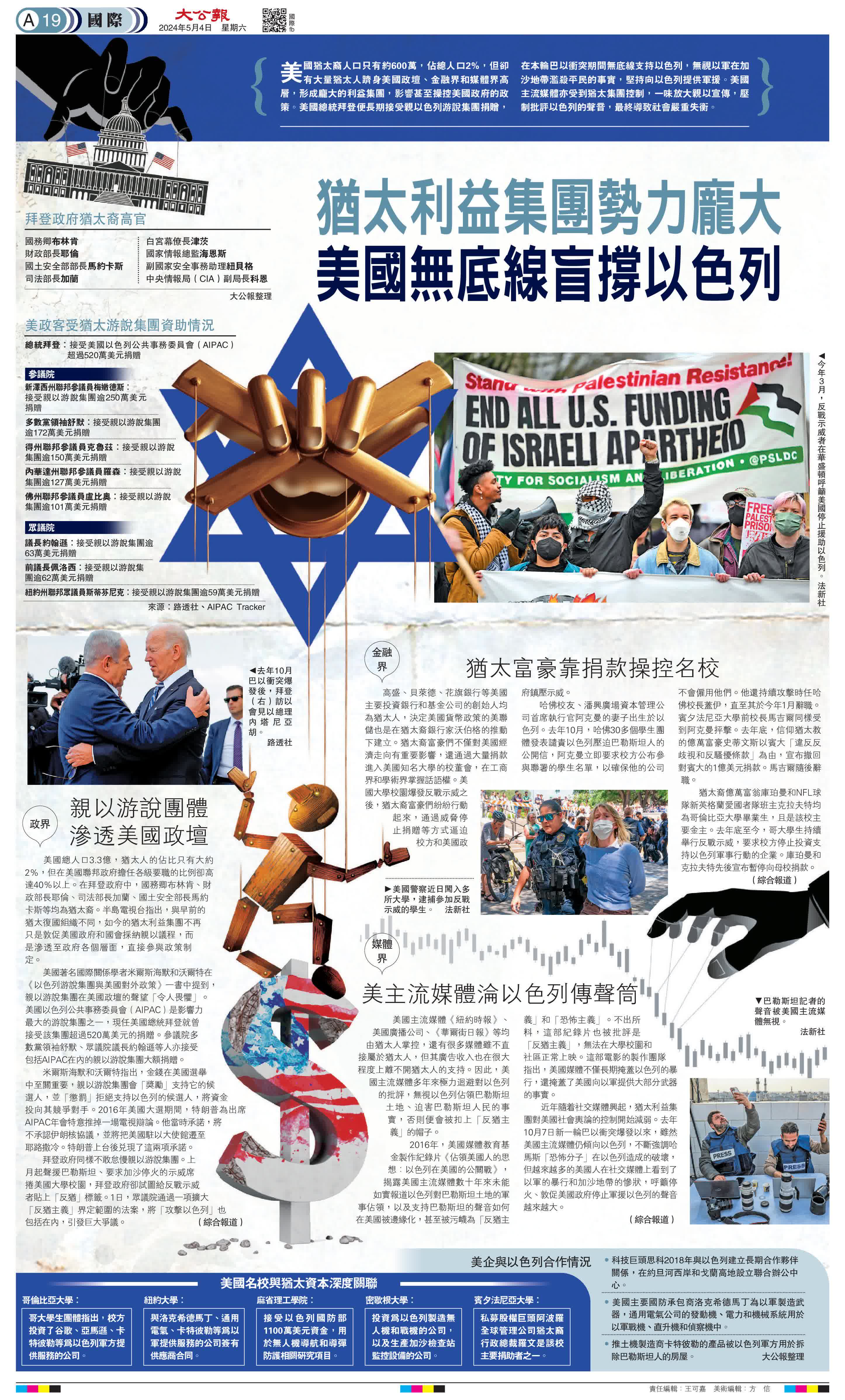 大公報綜合報道:美國猶太裔人口只有約600萬,佔總人口2%,但卻有大量猶太人躋身美國政壇、金融界和媒體界高層,形成龐大的利益集團,影響甚至操控美國政府的政策。美國總統拜登便長期接受親以色列游說集團捐贈,在本輪巴以衝突期間無底線支持以色列,無視以軍在加沙地帶濫殺平民的事實,堅持向以色列提供軍援。美國主流媒體亦受到猶太集團控制,一味放大親以宣傳,壓制批評以色列的聲音,最終導致社會嚴重失衡。