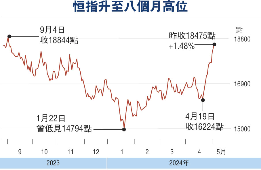 (香港文匯報記者 周紹基)港股氣勢如虹,恒指再創今年新高。受惠人民幣走強,港股連升9個交易日,創2018年以來最長連漲紀錄,9日累升2,251點或13.9%。大市昨日一度升近400點,升上18,600點水平,見近8個月來高位,收報18,475點,升268點或1.5%,大市成交1,162億元。分析指出,港股在內地五一長假期間維持升浪,全周4日市,恒指累升824點,顯示有海外資金持續入市。下周一A股復市,「北水」恢復,料可續為港股帶來支持。