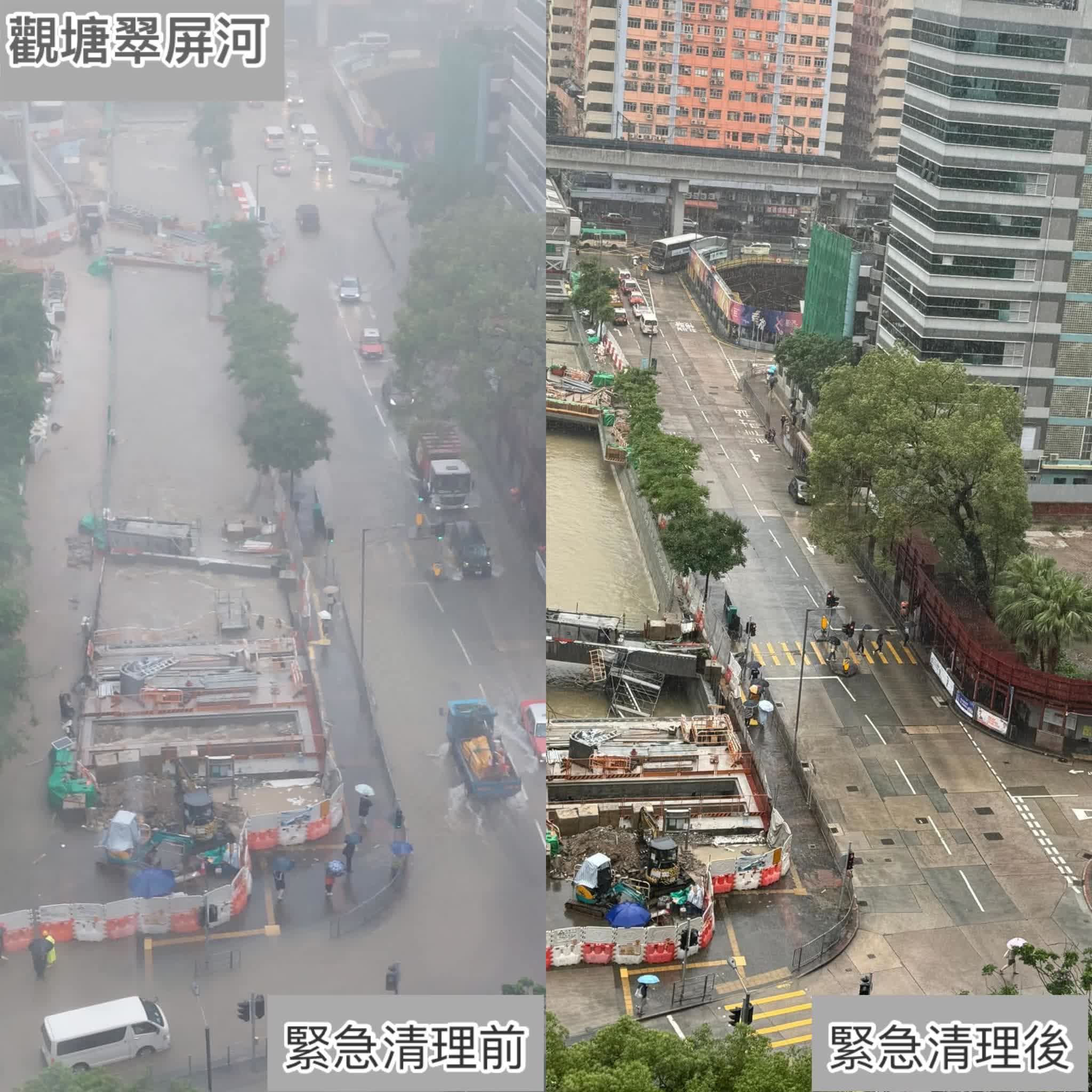 至於西貢區較早前因嚴重水浸全線封閉的道路,有賴於渠務署、運輸署、路政署、警方等迅速應對,大部分都可以在短時間內解封,交通回復正常。