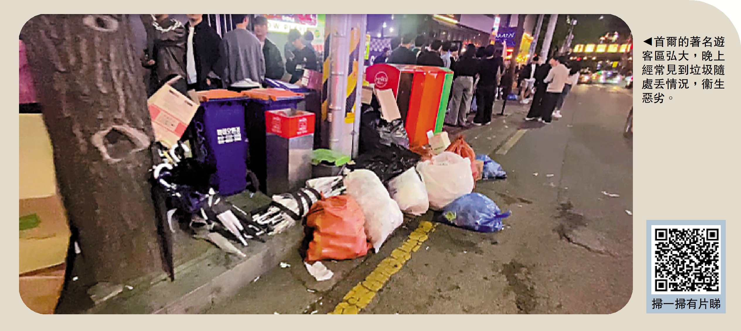 「韓國給我的感覺,好像周圍都是垃圾!」首次訪韓的旅客、港人陳先生在明洞區表示,對韓國第一觀感印象並不良好,他指着街頭上垃圾說,作為旅遊城市的首爾,周圍總是看到一堆紙箱、垃圾袋等,「看!那邊的塑膠杯,好像小鳥一字排開。」