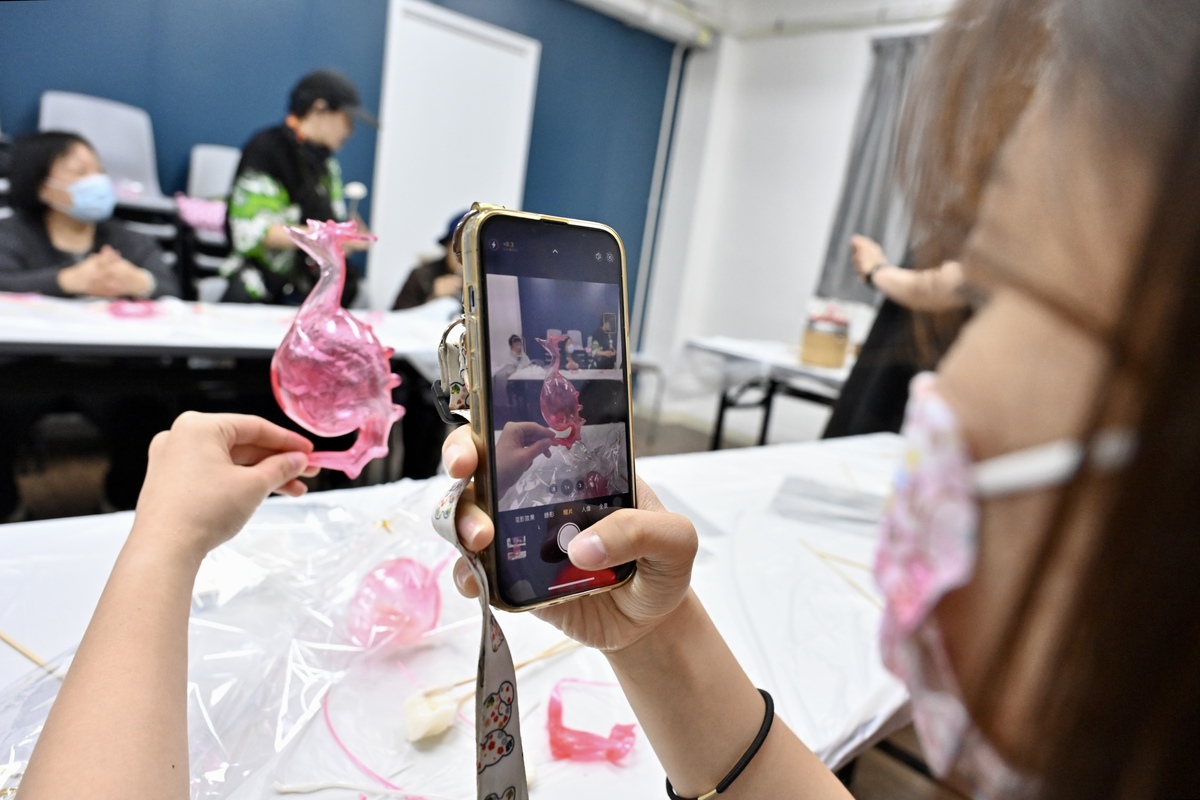 杜師傅這天專誠由長洲來到香港社區組織協會位於深水埗的其中一個會址,就是要向十多名吹糖體驗工作坊參加者示範和教授這種傳統民間手工藝。參加者都是來自基層的弱勢社群,這是他們首次近距離接觸非物質文化遺產。他們全神貫注細看杜師傅大顯身手,除了觀摩,更有機會親自動手。杜師傅先把糖料捏成管狀,管的一邊讓參加者吹氣,另一邊糖料開始脹大,杜師傅趁機示範捏成不同造型,參加者從中學習吹糖的各種技巧。