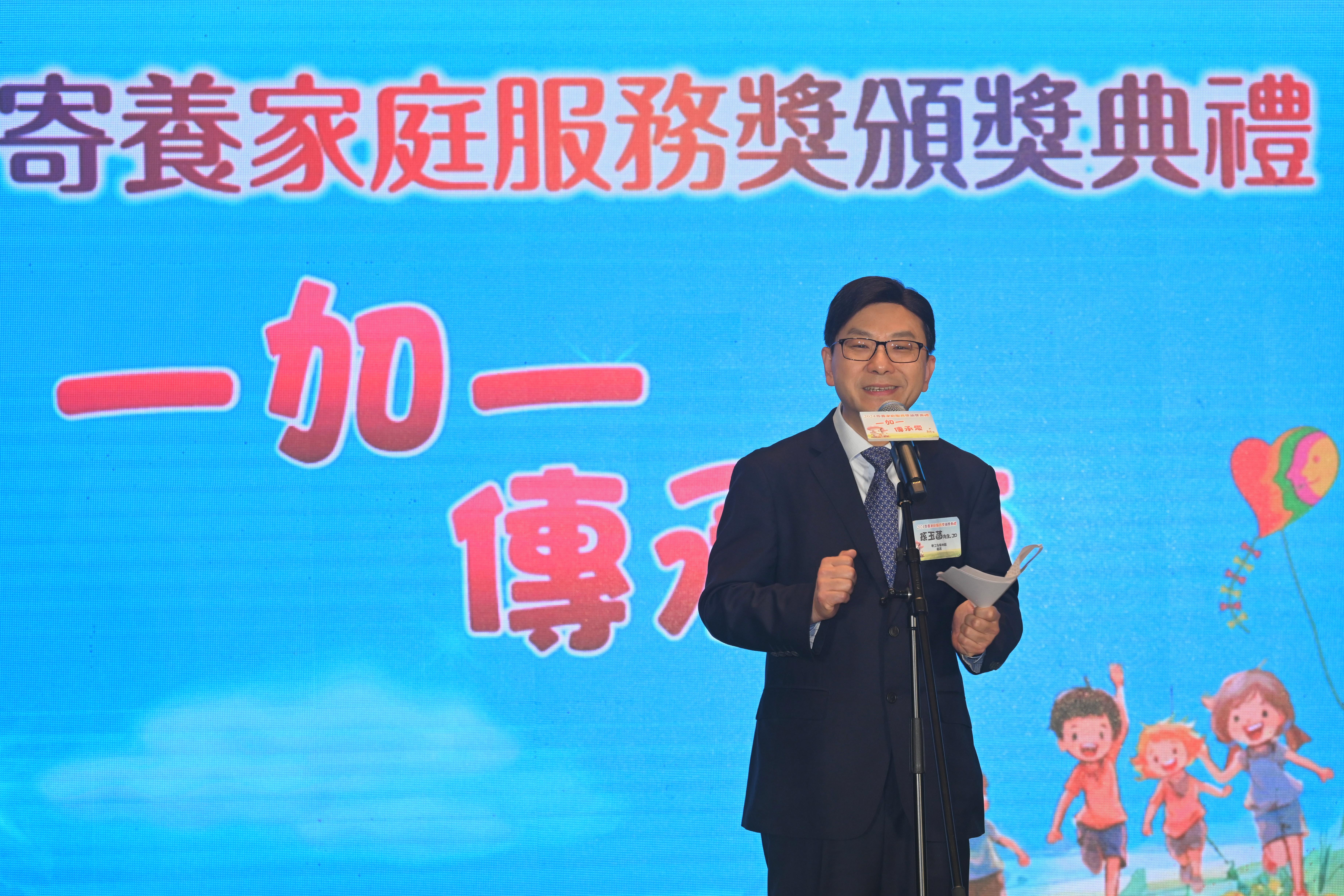 頒獎典禮由社會福利署和11間獲社署資助營運寄養服務的非政府機構攜手合辦,以「一加一 傳承愛」為主題,推廣社署推出的「1+1」組合寄養家庭招募模式。
