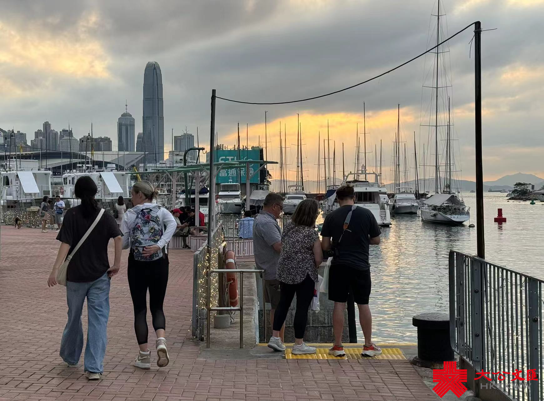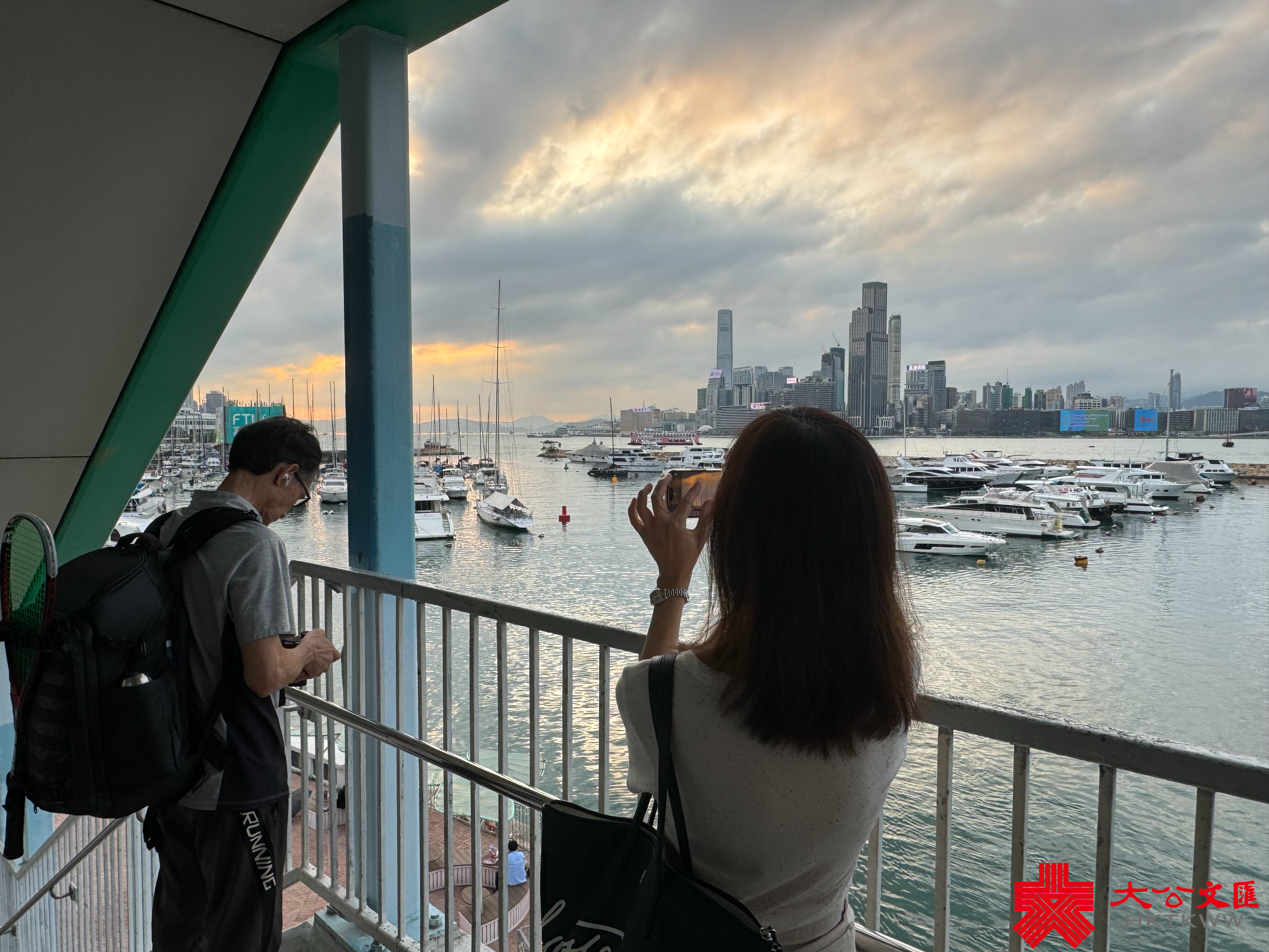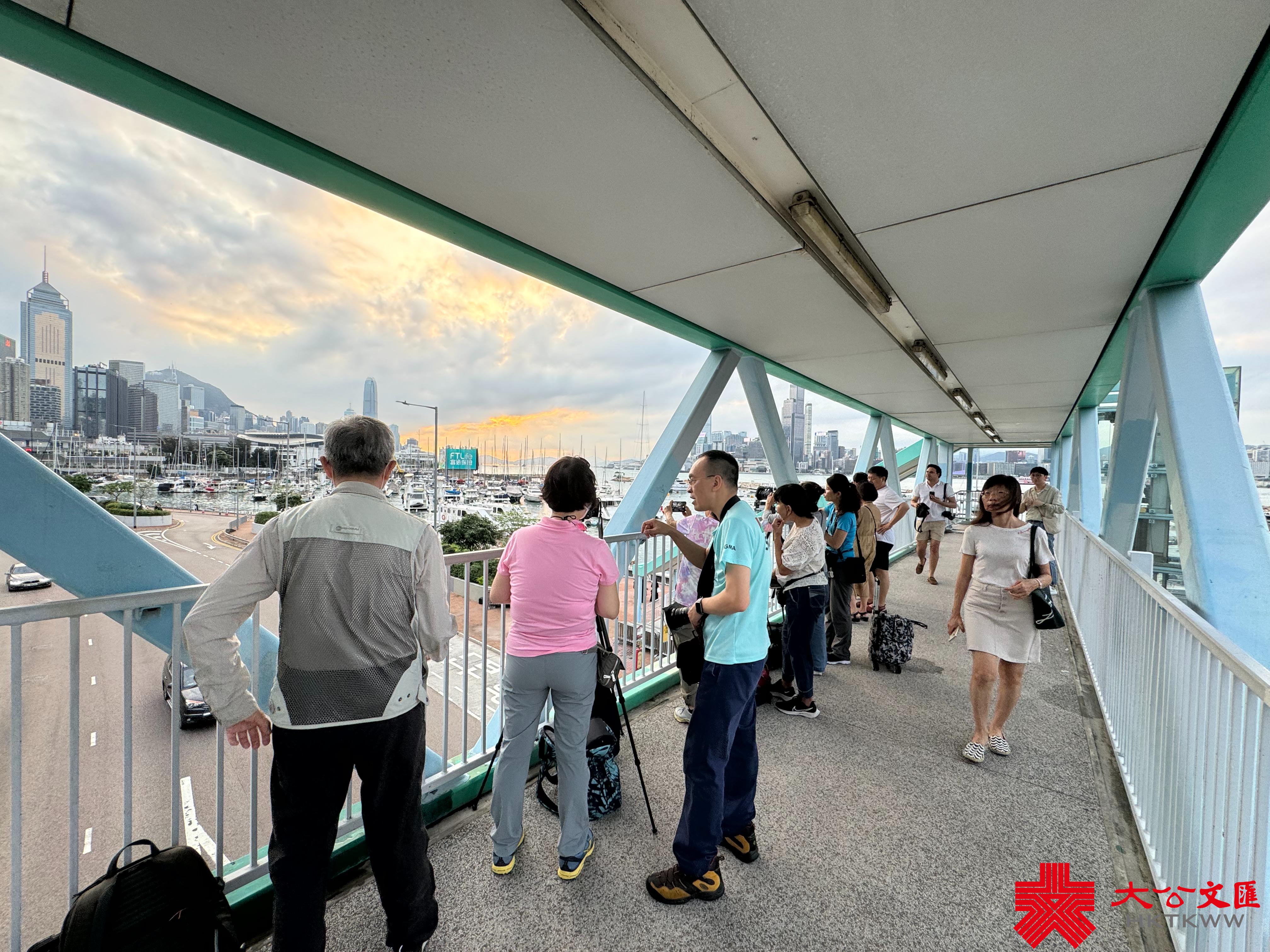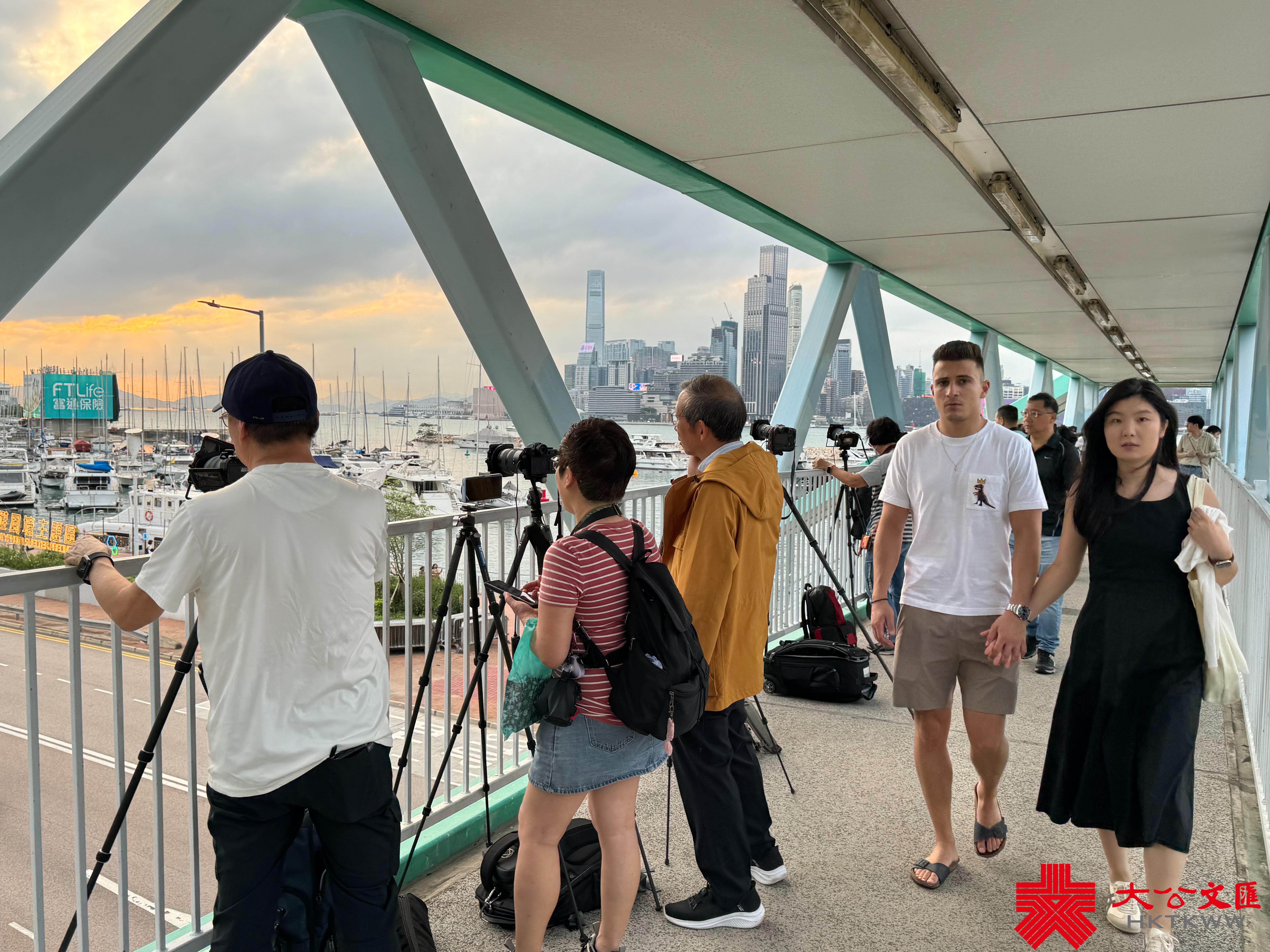 大公文匯全媒體報道,香港連日有雨,今日(5日)亦有一兩陣驟雨,部分時間可見陽光。今日下午本港部分地區放晴。黃昏時分,維港海面和黃昏的餘暉交相輝映,畫面寧靜美好。市民遊客紛紛在天橋上選取最佳攝影角度拍照留念,還有人帶同自家毛孩出街拍照,十分得意。