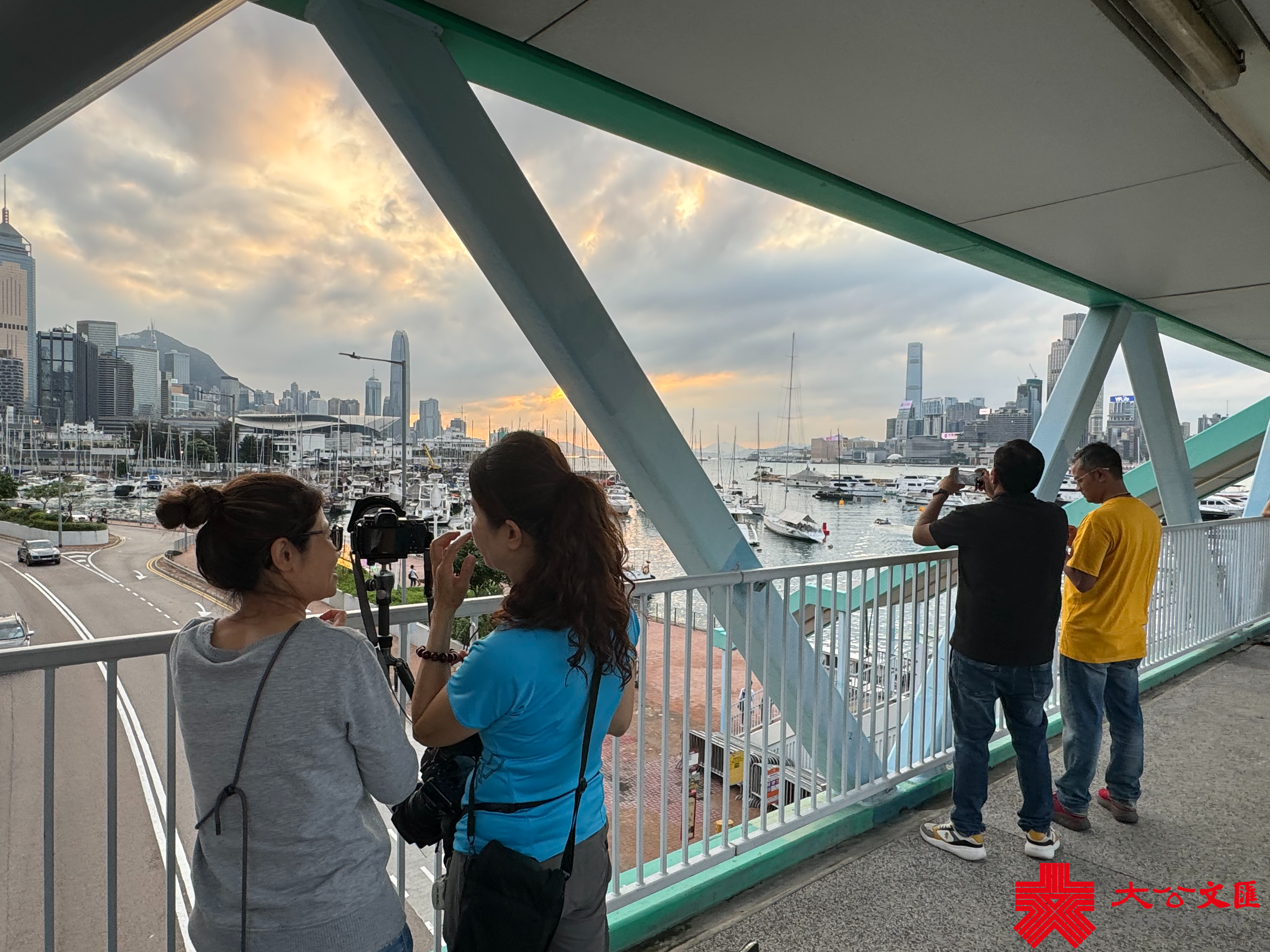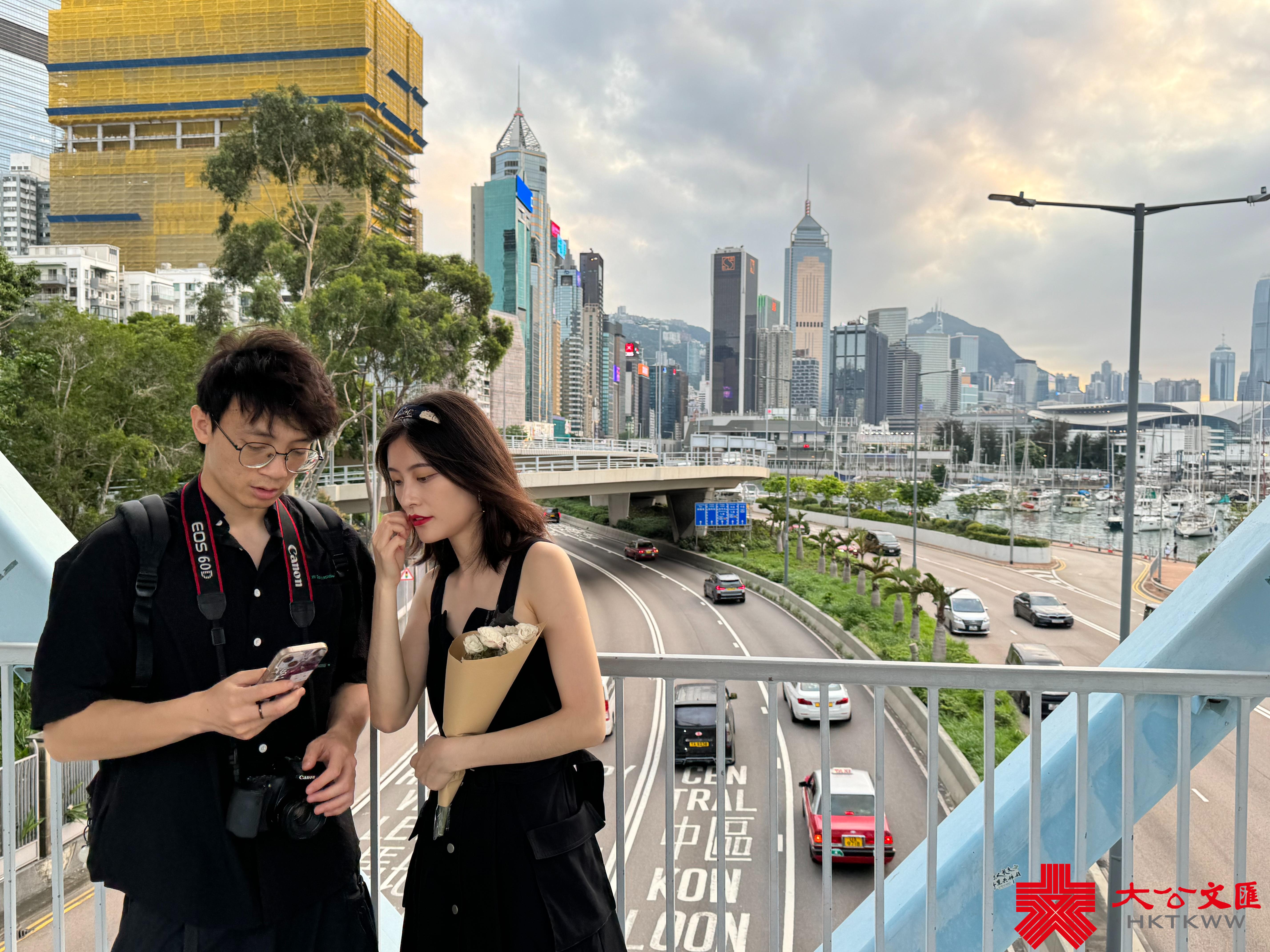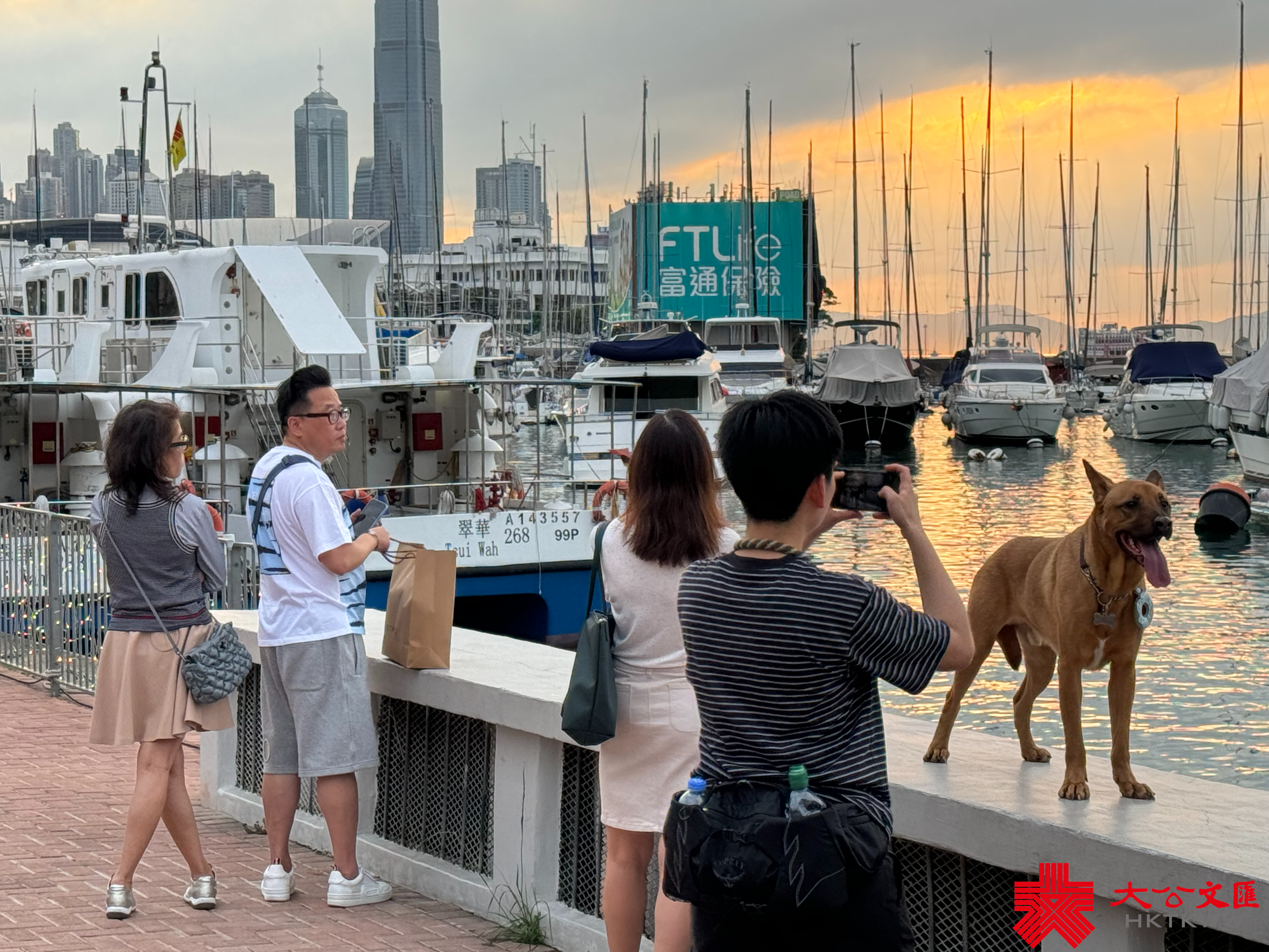 大公文匯全媒體報道,香港連日有雨,今日(5日)亦有一兩陣驟雨,部分時間可見陽光。今日下午本港部分地區放晴。黃昏時分,維港海面和黃昏的餘暉交相輝映,畫面寧靜美好。市民遊客紛紛在天橋上選取最佳攝影角度拍照留念,還有人帶同自家毛孩出街拍照,十分得意。