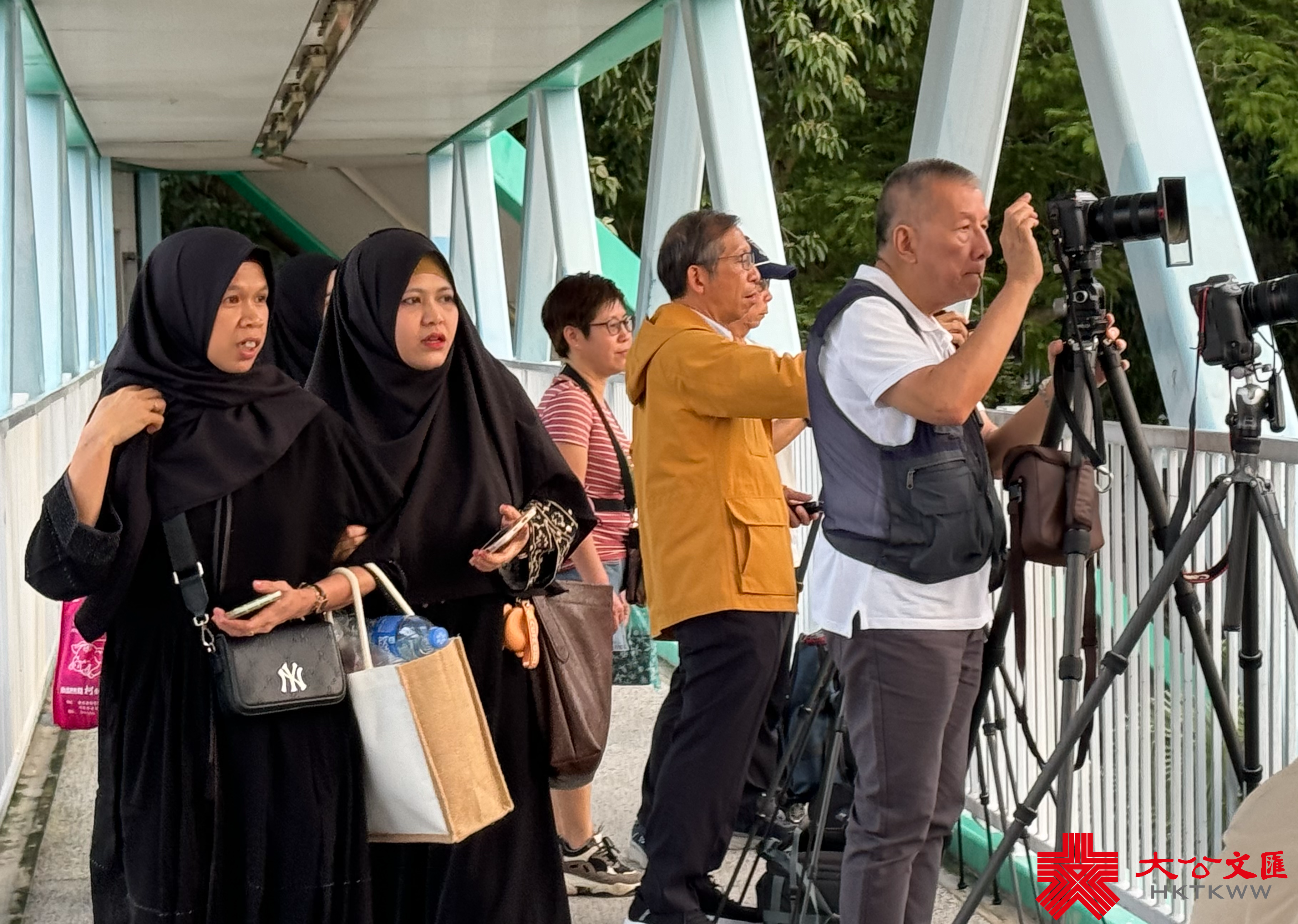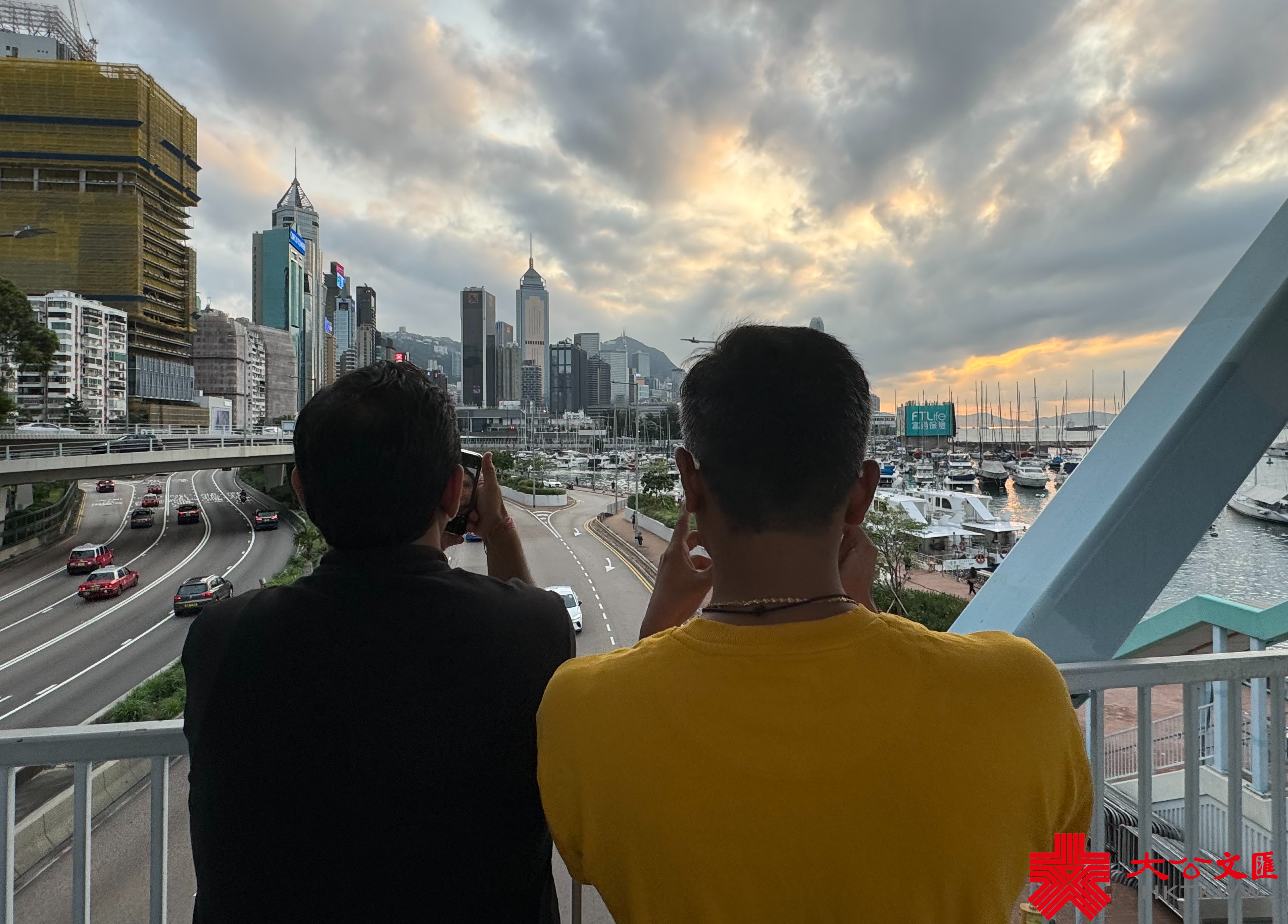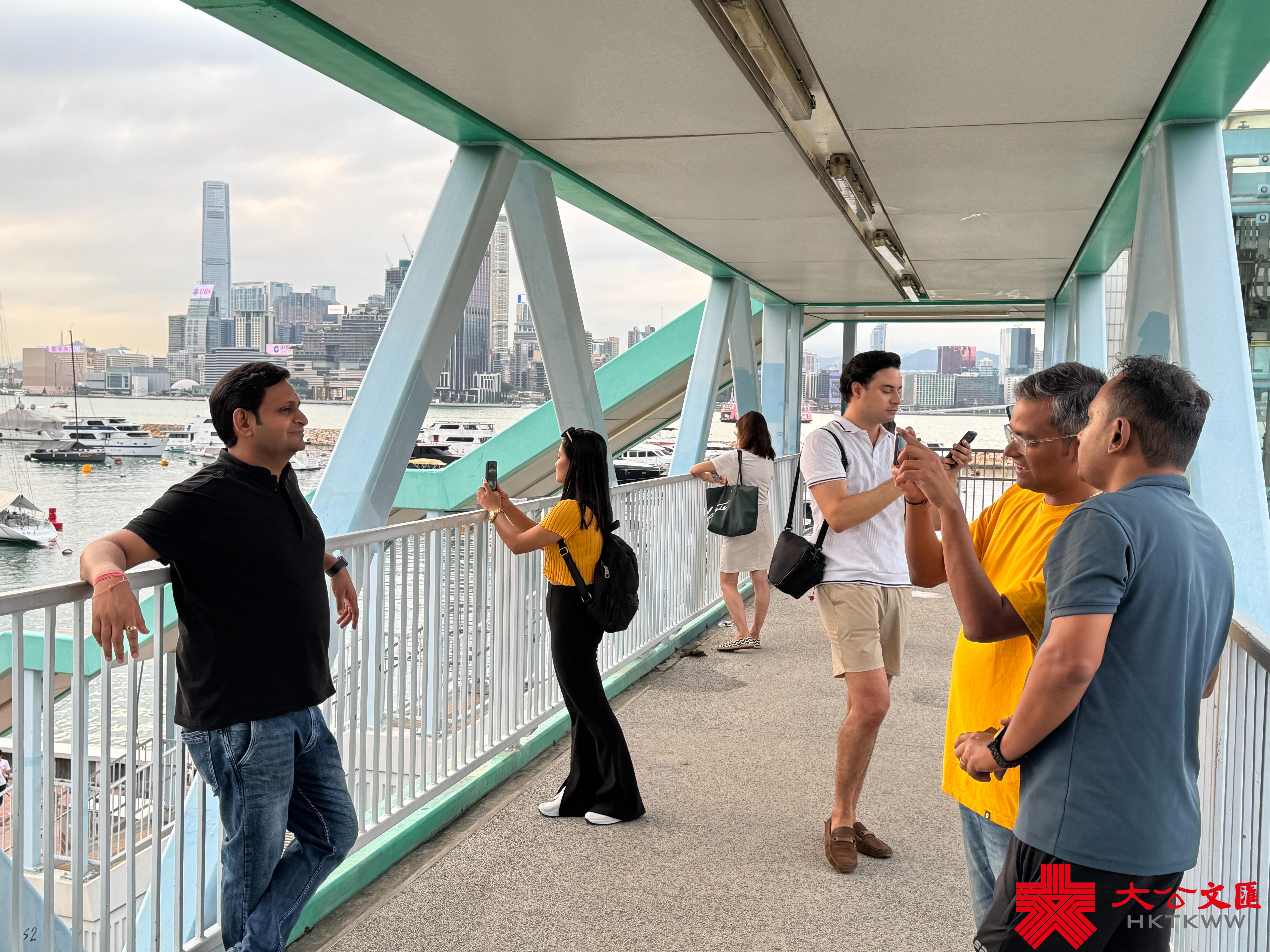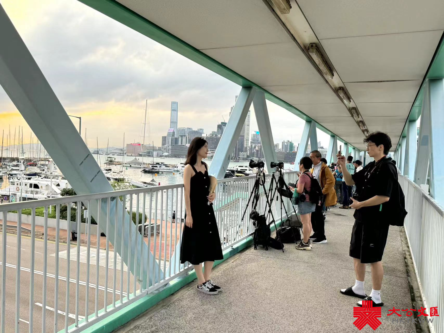 大公文匯全媒體報道,香港連日有雨,今日(5日)亦有一兩陣驟雨,部分時間可見陽光。今日下午本港部分地區放晴。黃昏時分,維港海面和黃昏的餘暉交相輝映,畫面寧靜美好。市民遊客紛紛在天橋上選取最佳攝影角度拍照留念,還有人帶同自家毛孩出街拍照,十分得意。
