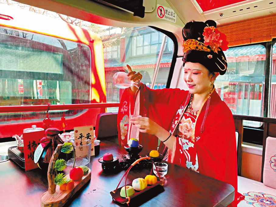 「主題觀光車『長安尋夢』沉浸式體驗遊時空之旅,不僅在車內設置了飛花令、雅樂告神、逛花燈等互動,同時還在大明宮站點設置了投壺、射箭、搖骰子等遊戲,寓教於樂又妙趣橫生。」來自寧夏銀川的遊客張涵芋說。