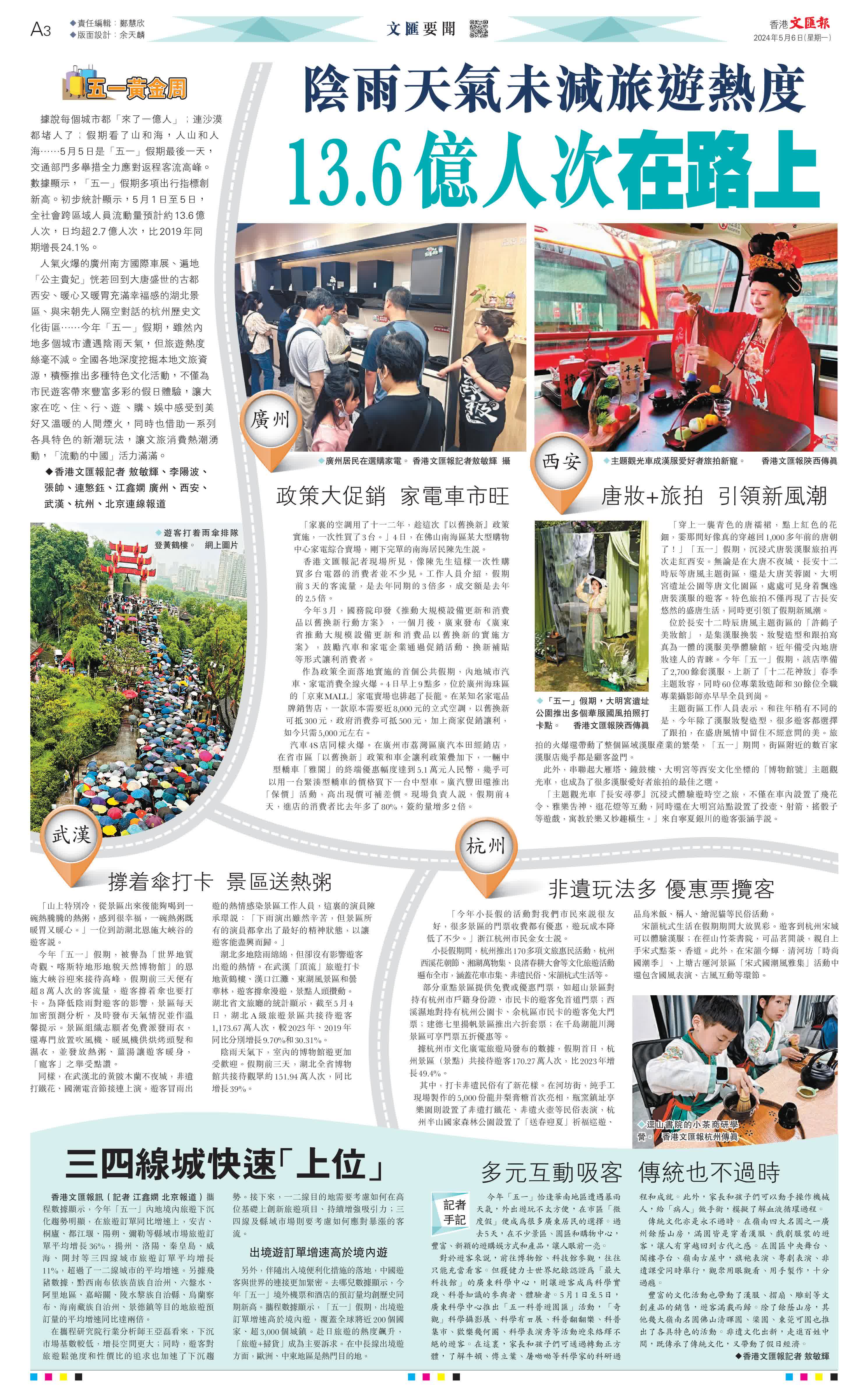 人氣火爆的廣州南方國際車展、遍地「公主貴妃」恍若回到大唐盛世的古都西安、暖心又暖胃充滿幸福感的湖北景區、與宋朝先人隔空對話的杭州歷史文化街區……今年「五一」假期,雖然內地多個城市遭遇陰雨天氣,但旅遊熱度絲毫不減。全國各地深度挖掘本地文旅資源,積極推出多種特色文化活動,不僅為市民遊客帶來豐富多彩的假日體驗,讓大家在吃、住、行、遊 、購、娛中感受到美好又溫暖的人間煙火,同時也借助一系列各具特色的新潮玩法,讓文旅消費熱潮湧動,「流動的中國」活力滿滿。