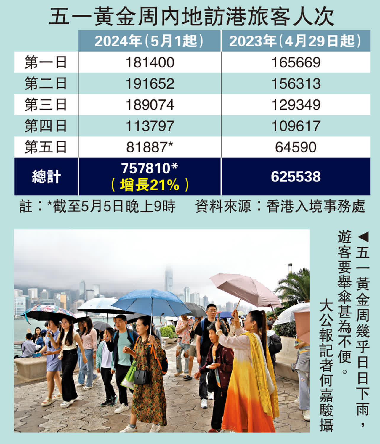(大公報 記者 鍾佩欣 賴振雄)五一黃金周假期昨日結束,截至昨晚9時,五日累計約76萬內地旅客訪港,接近政府估計的80萬人次,較去年同期增長逾兩成。文化體育及旅遊局局長楊潤雄表示,雖然連日大雨,但五一假期料可為本港帶來逾20億元收益,政府未來會加強發展深度遊吸引旅客。