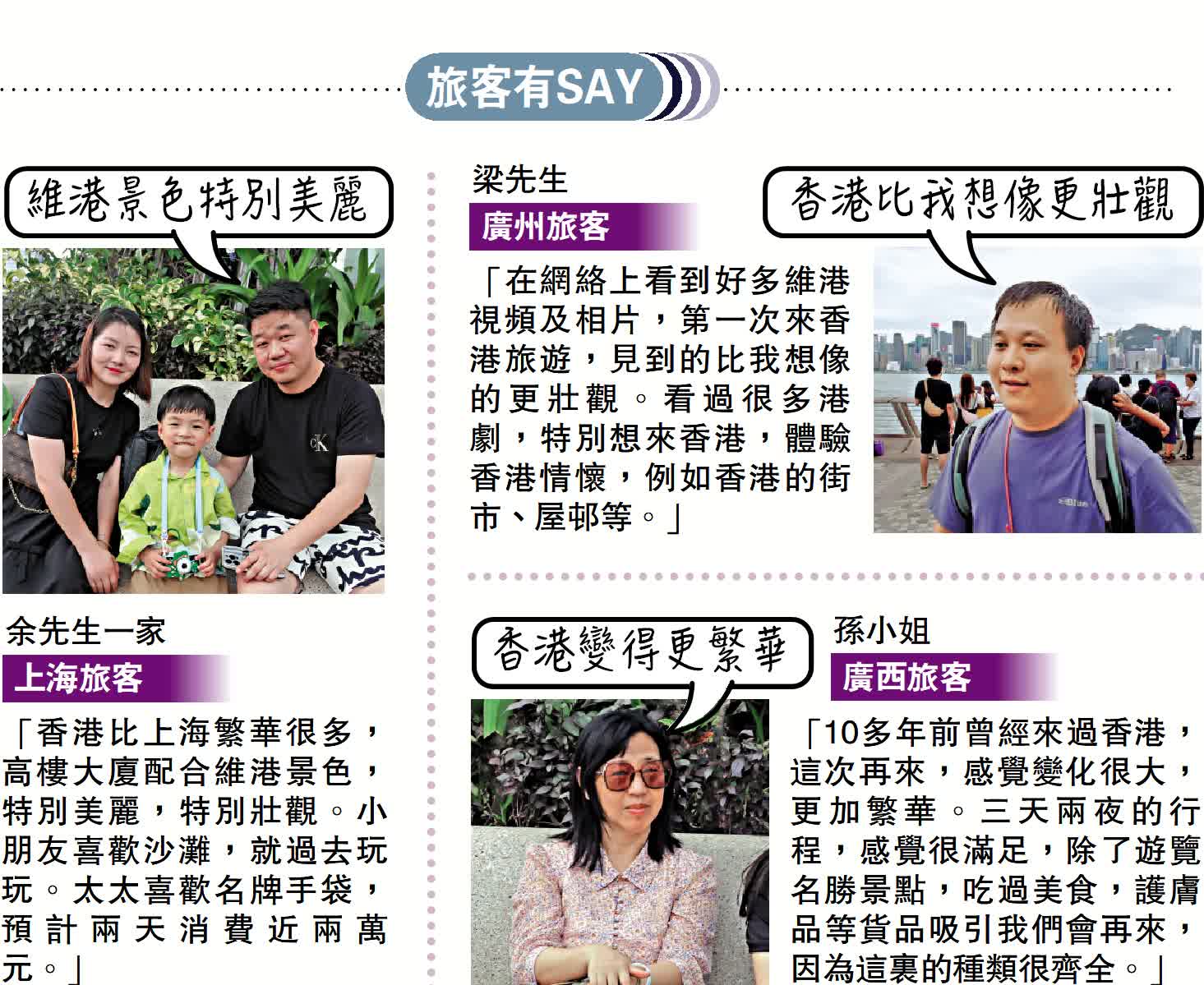 「坐在這(維港)都好舒服。」來自廣西的孫小姐一家人,昨午在星光大道拍照留念,她大讚遊港體驗良好,特意預留一天到油尖旺區「打卡」拍照、購物、吃美食等,預計留港三天兩夜。