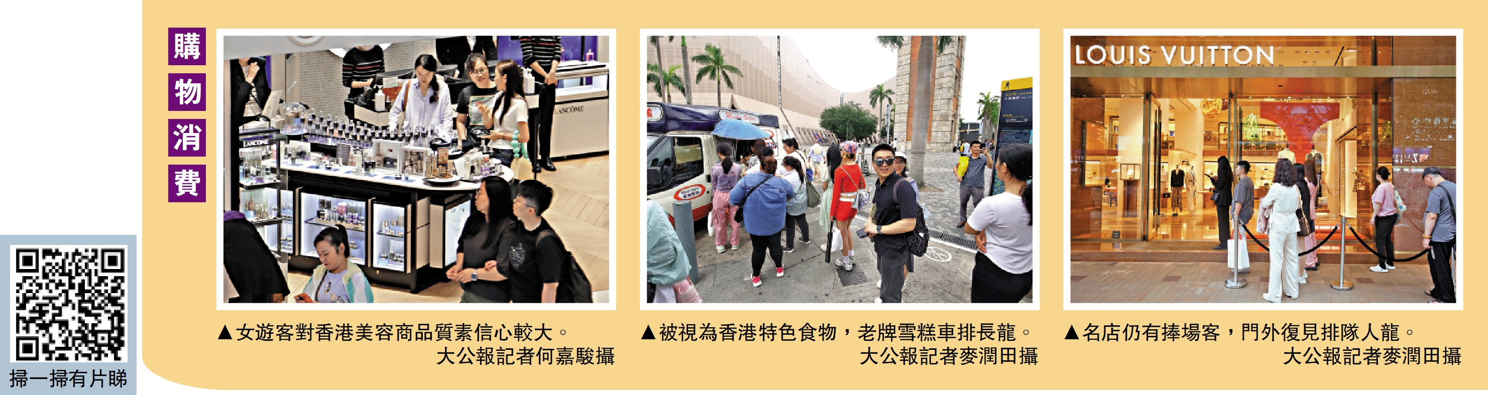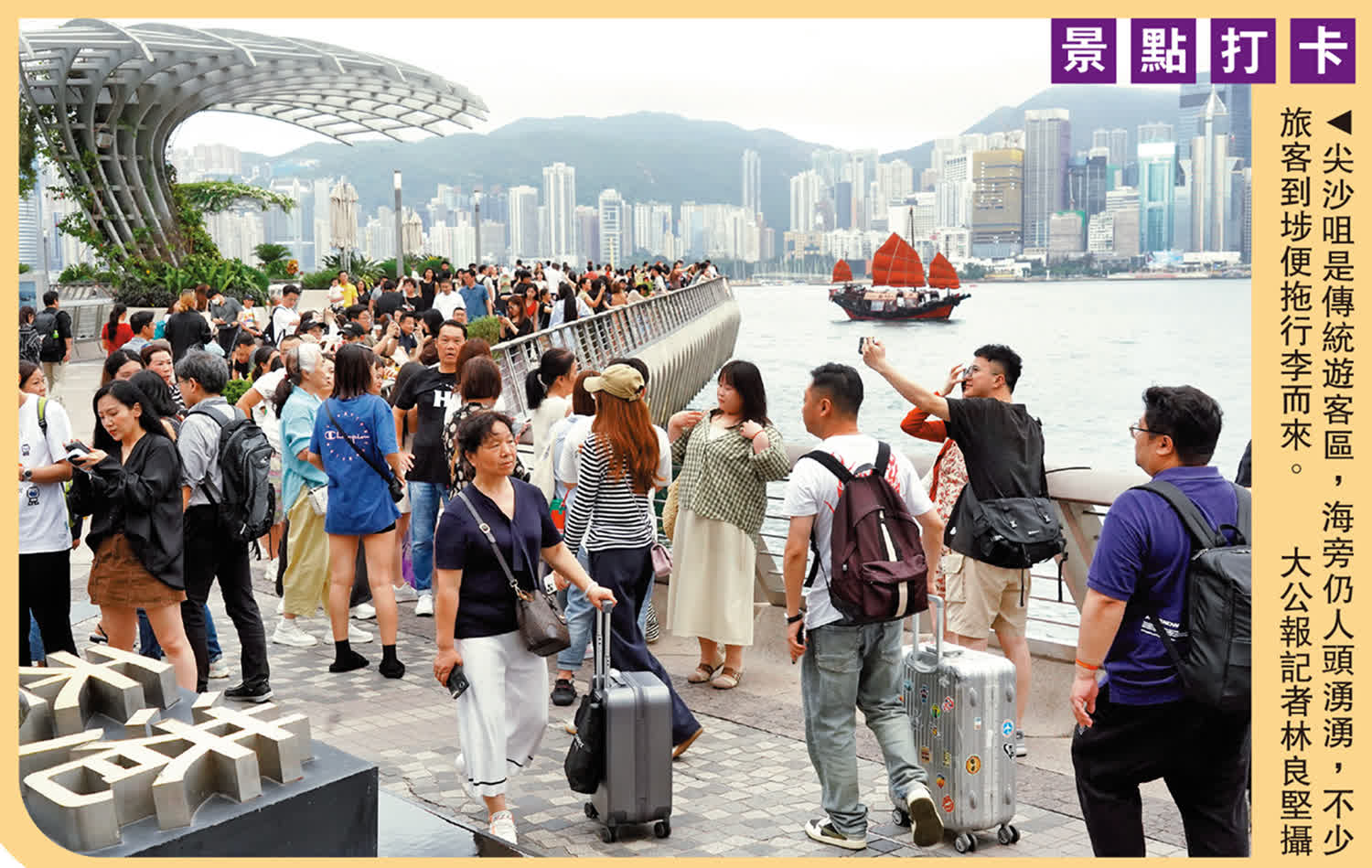 入境處數據顯示,昨日截至晚上9時,昨日有超過八萬名內地旅客入境香港。大公報記者昨日在尖沙咀一帶,見到不少內地旅客抓着黃金周的尾巴四出遊覽。來自上海的余先生一家三口,此行來港兩日一夜,預計花費近二萬元,他大讚香港市面繁榮,電子支付交易方便,不負「購物天堂」美譽,既適合太太購買名牌手袋、護膚品等,也有兒子喜歡去的玩耍的沙灘,行程滿滿。