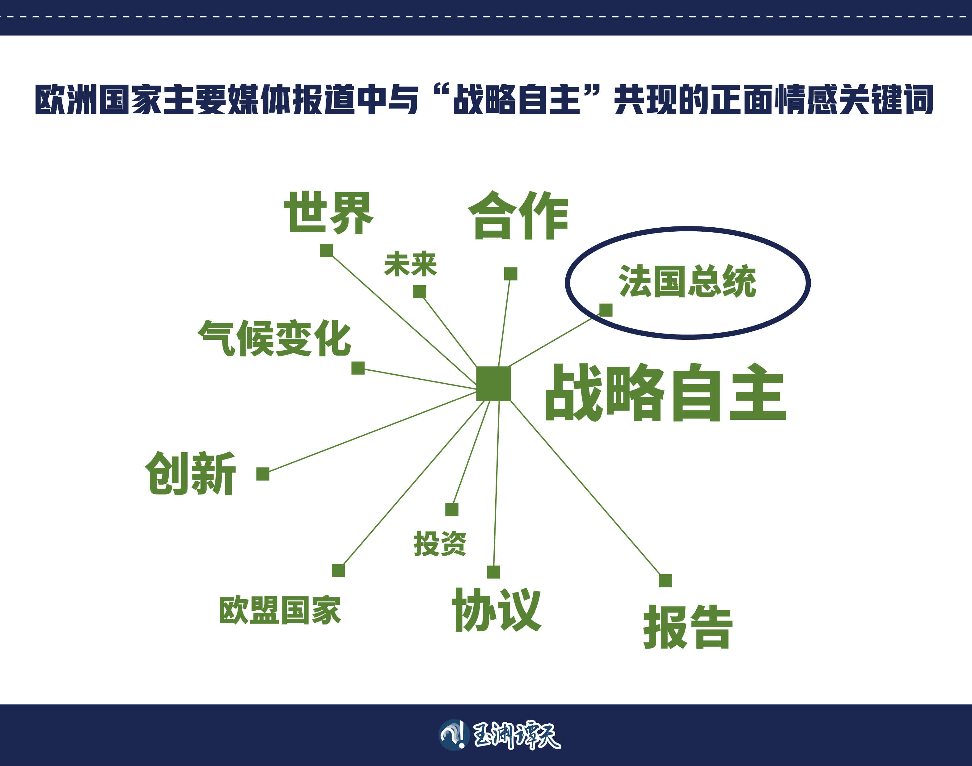 在對歐洲國家主要媒體報道中與「戰略自主」共現的正面情感關鍵詞進行分析後,譚主發現,「法國總統」是其中出現的高頻詞。