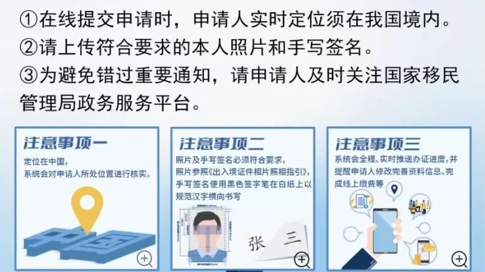 ③為避免錯過重要通知,請申請人及時關注國家移民管理局政務服務平台,系統會全程、實時推送辦證進度,並提醒申請人修改完善資料信息、完成線上繳費等。