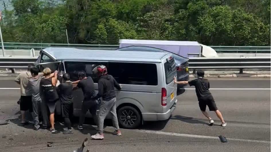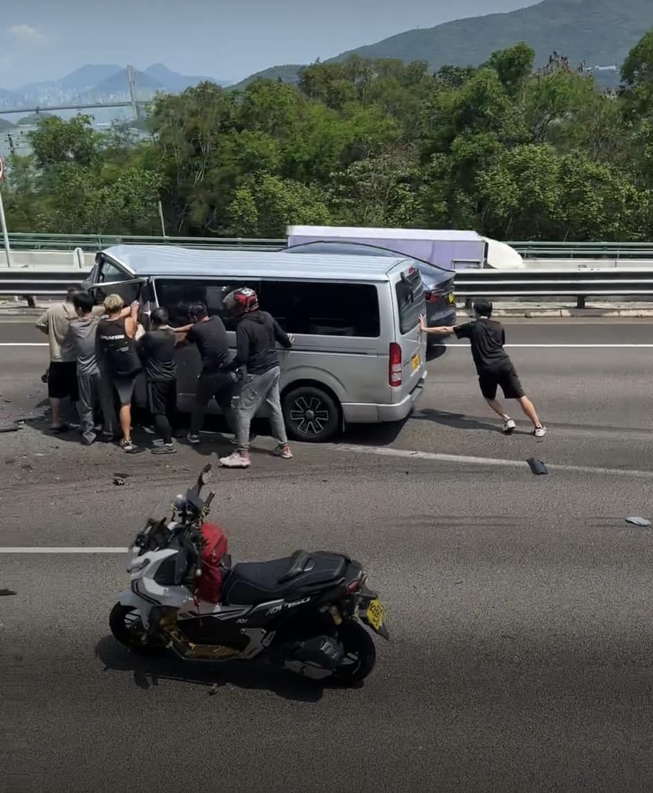 現場消息指,事發時其中一車疑因故障停下,另一車收掣不及釀意外。多名途經司機下車施援,由於現場為斜路,有司機幫忙「頂住」客貨車車尾,以防溜後。