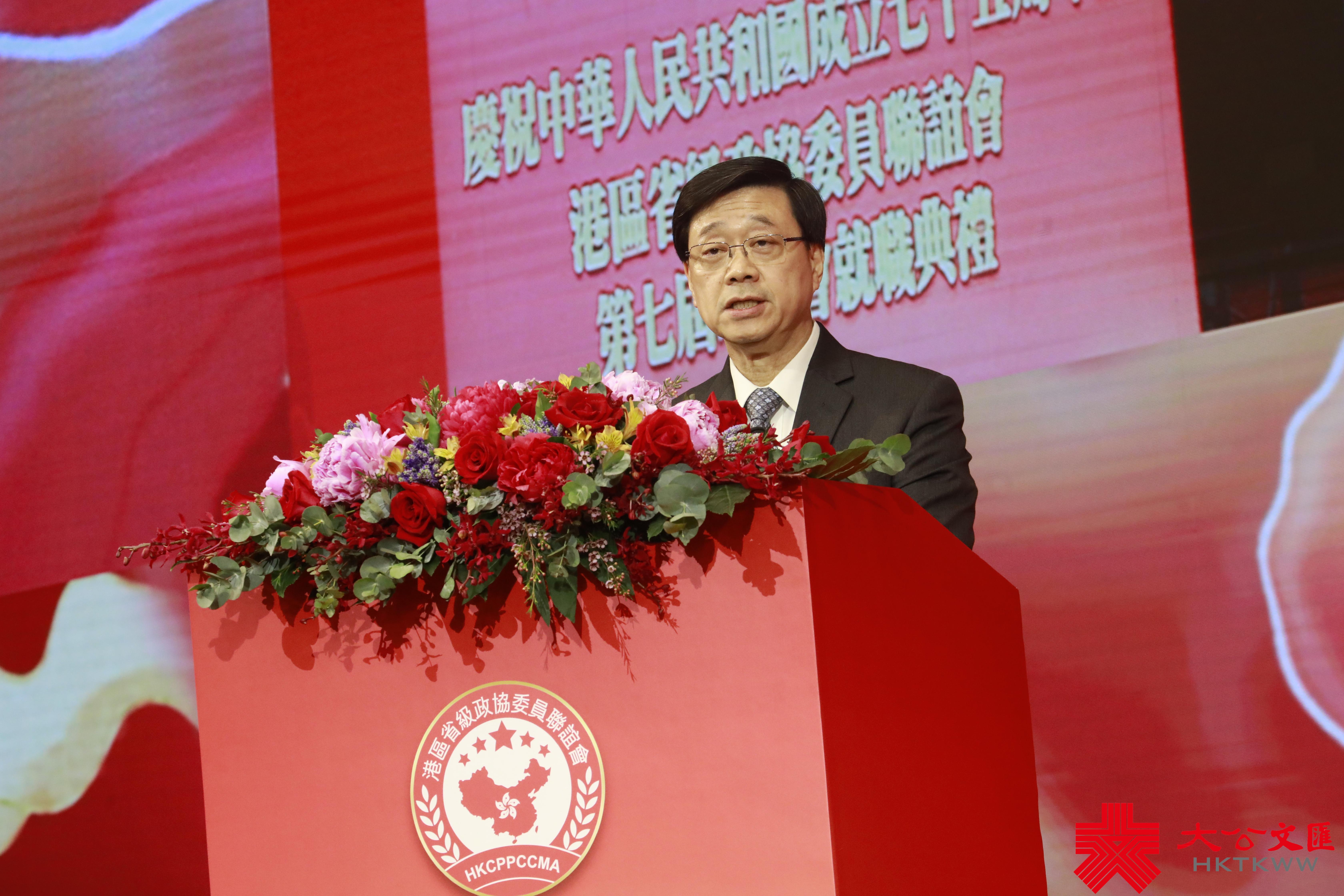 李家超在致辭時表示,港區省級政協委員聯誼會一直秉承「服務國家、服務香港」的宗旨,多年來團結社會各界,為香港的建設出謀獻策,為國家的高質量發展作出貢獻。此外,聯誼會在香港邁向由治及興的道路上,一直堅持擁護特區政府,並積極向公眾說好國家故事,全力維護國家安全和香港穩定。李家超肯定聯誼會的貢獻。