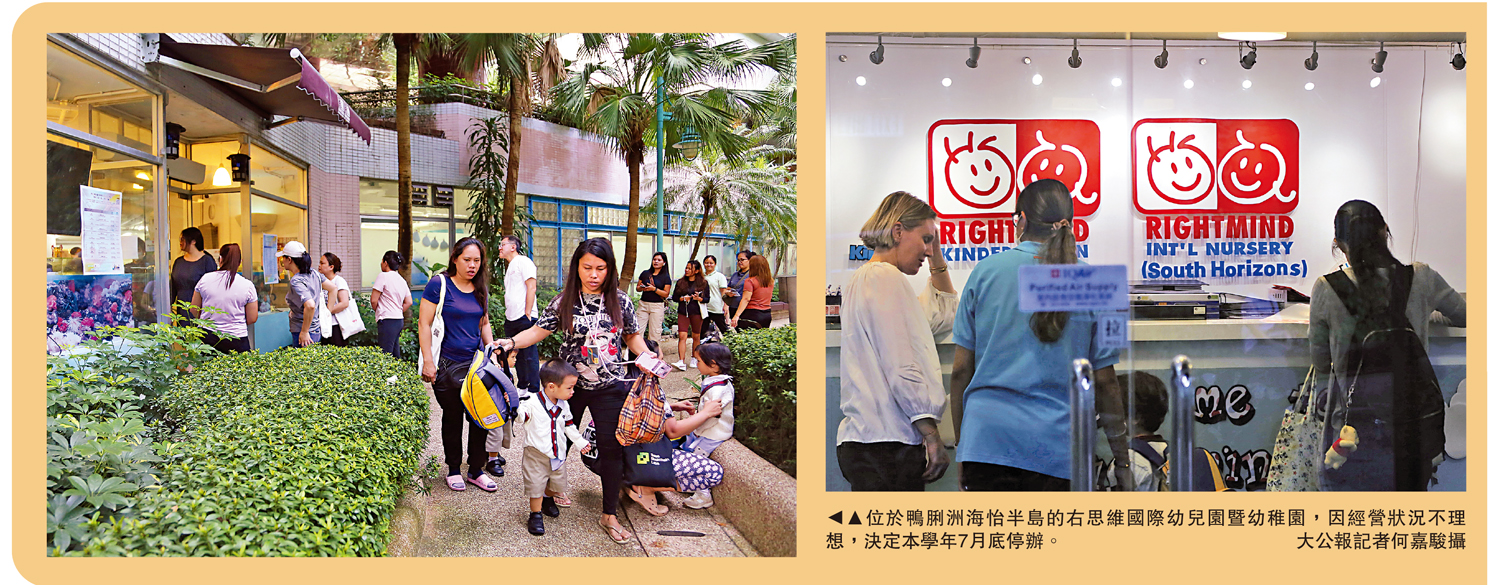 (大公報記者 郭如佳、華英明)幼稚園結業潮持續,教育局截至上月錄得14間幼稚園將於本學年內停辦。而繼上周沙田區內兩間幼稚園宣布明年停辦後,昨日,位於鴨脷洲海怡半島的右思維國際幼兒園暨幼稚園,亦宣布將於今年7月底結束營運。