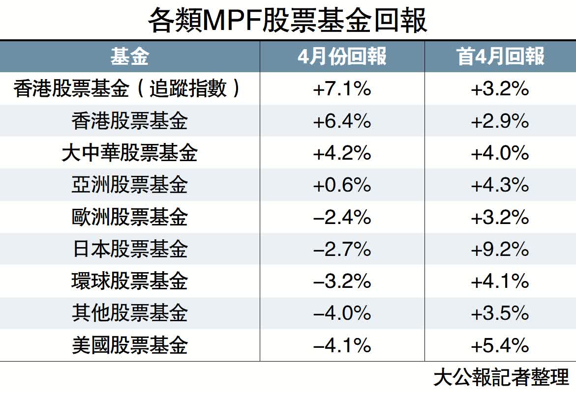 環顧全球主要股市,港股在4月份一馬當先,累積升幅超過7%,令到強積金(MPF)下的港股基金錄得6%至7%回報。不過,強積金顧問公司GUM發現,打工仔持有的強積金在4月份平均錄得572元虧損。GUM常務董事陳銳隆表示,今次港股反彈主要受惠於內地推出的5項惠港措施,當中包括優化滬港通機制,從而吸引內地投資者來港投資。全球市場則在4月份出現回調,相信隨着5月份美國踏入業績期,股市波動將會擴大。4月份GUM強積金綜合指數下跌0.2%至230.5點。