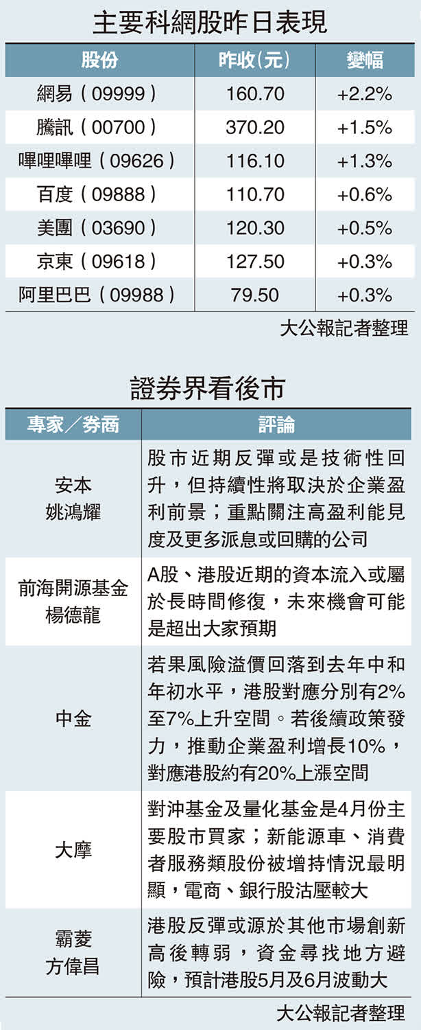 (大公報 記者 周寶森)內地A股在五一長假期後復市飆高,配合外圍市場積極氣氛,港股連升第10個交易日;恒指昨日反覆高收102點。中金表示,若果後續政策發力,拉動企業盈利有10%升幅,對應港股料有約20%上漲空間。另有分析指出,港股升勢持續性將取決於企業盈利前景,重點關注高盈利能見度及更多派息或回購的公司。工業股昨日追落後大漲,科網股靠穩支撐港股向上。