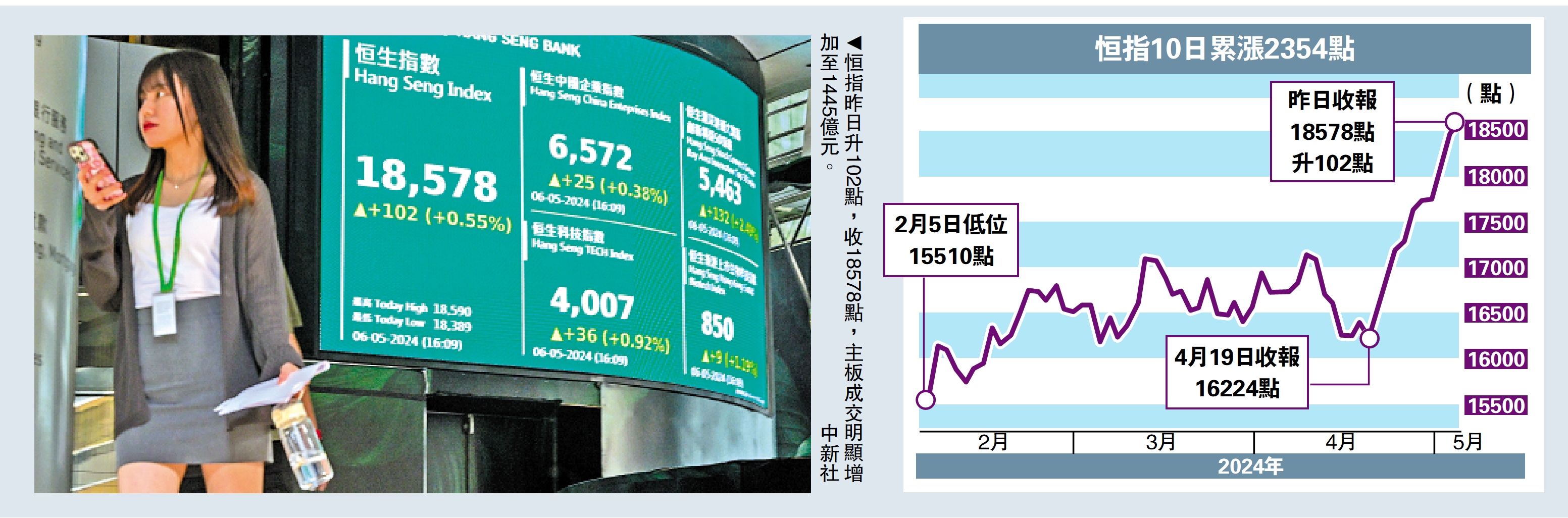 資金入市追貨不缺席,港股連升10日。恒指早段消化獲利盤後,午後重拾升軌,全日報升102點,收18578點,惟受制於上周五(3日)即市高位18604點。科指企穩4000點收市,升36點,報4007點。港股通復市,主板成交明顯增加至1445億元,較上日增加283億元。南下資金昨日經由港股通買入365.58億元港股,較上日增加145.35億元,淨買入50.87億元,增加18.37億元。北水主力吸納盈富基金(02800),淨買入達到55.24億元。