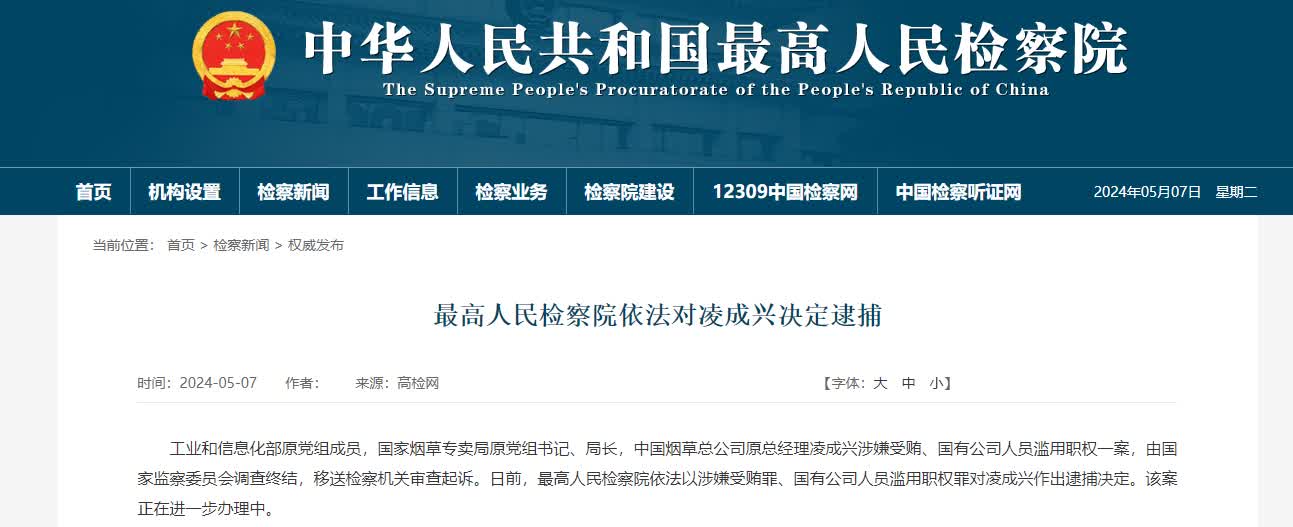 大公文匯網報道,記者今日(5月7日)從最高人民檢察院獲悉,工業和信息化部原黨組成員,國家煙草專賣局原黨組書記、局長,中國煙草總公司原總經理凌成興涉嫌受賄、國有公司人員濫用職權一案,由國家監察委員會調查終結,移送檢察機關審查起訴。日前,最高人民檢察院依法以涉嫌受賄罪、國有公司人員濫用職權罪對凌成興作出逮捕決定。該案正在進一步辦理中。